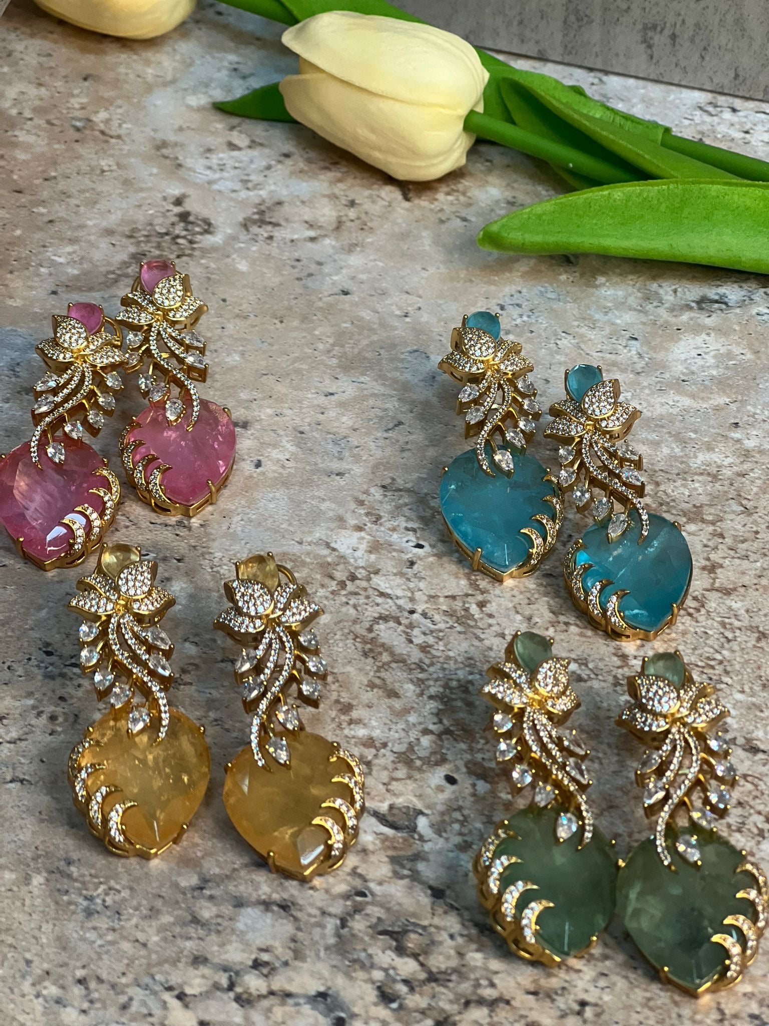 A stunning collection of vibrant hues—pink, aqua, yellow, and green—adorned with intricate crystal-encrusted floral motifs. These earrings combine bold color with timeless elegance, perfect for making a statement on any occasion.
