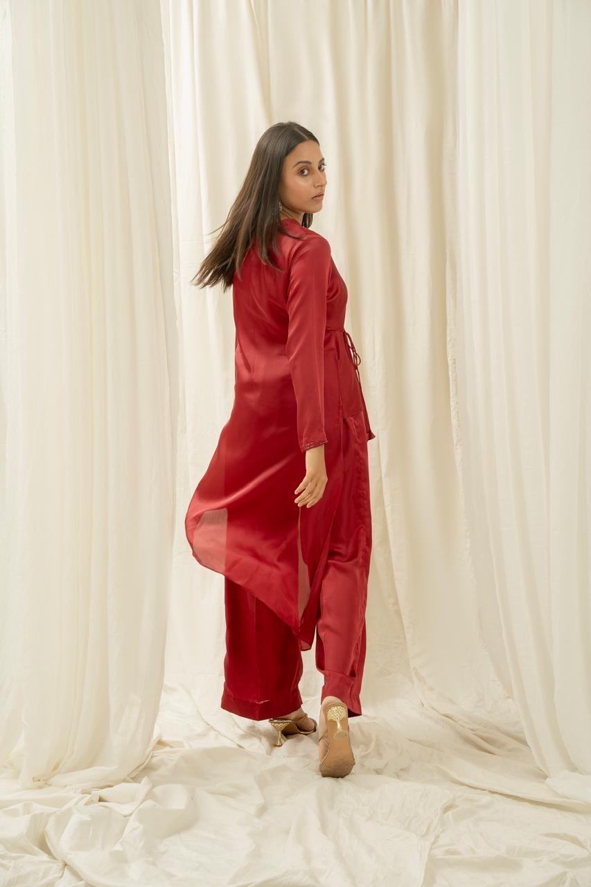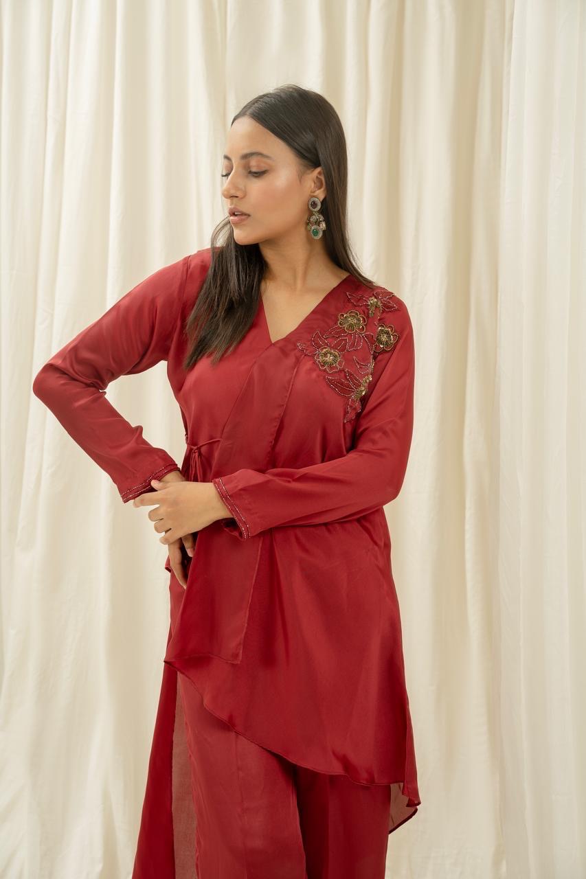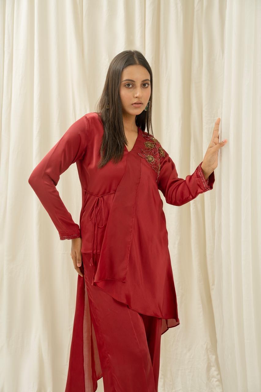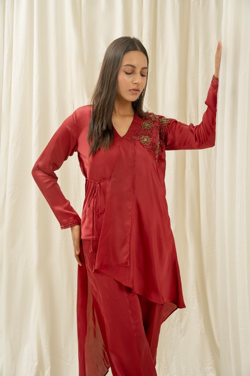 This exquisite asymmetrical wrap tie shirt, crafted from luxurious charmeuse silk, is a statement of modern elegance. Adorned with hand-embroidered beads, sequins, and detailed adda work, the shirt showcases a delicate blend of tradition and contemporary flair. The asymmetrical design and wrap-tie detail create a flattering silhouette, perfect for elevating any occasion. Paired with wide-leg pants, this ensemble offers effortless sophistication, balancing fluidity with structure for a truly standout look.