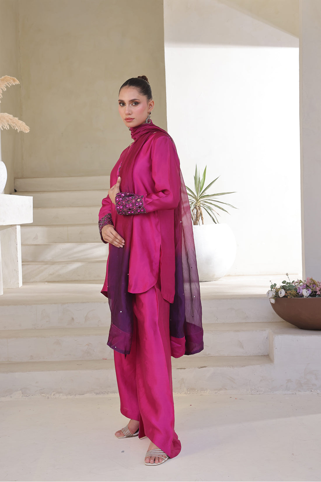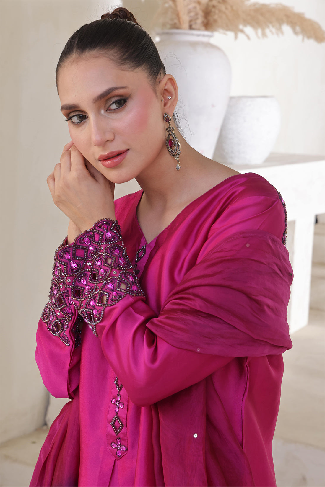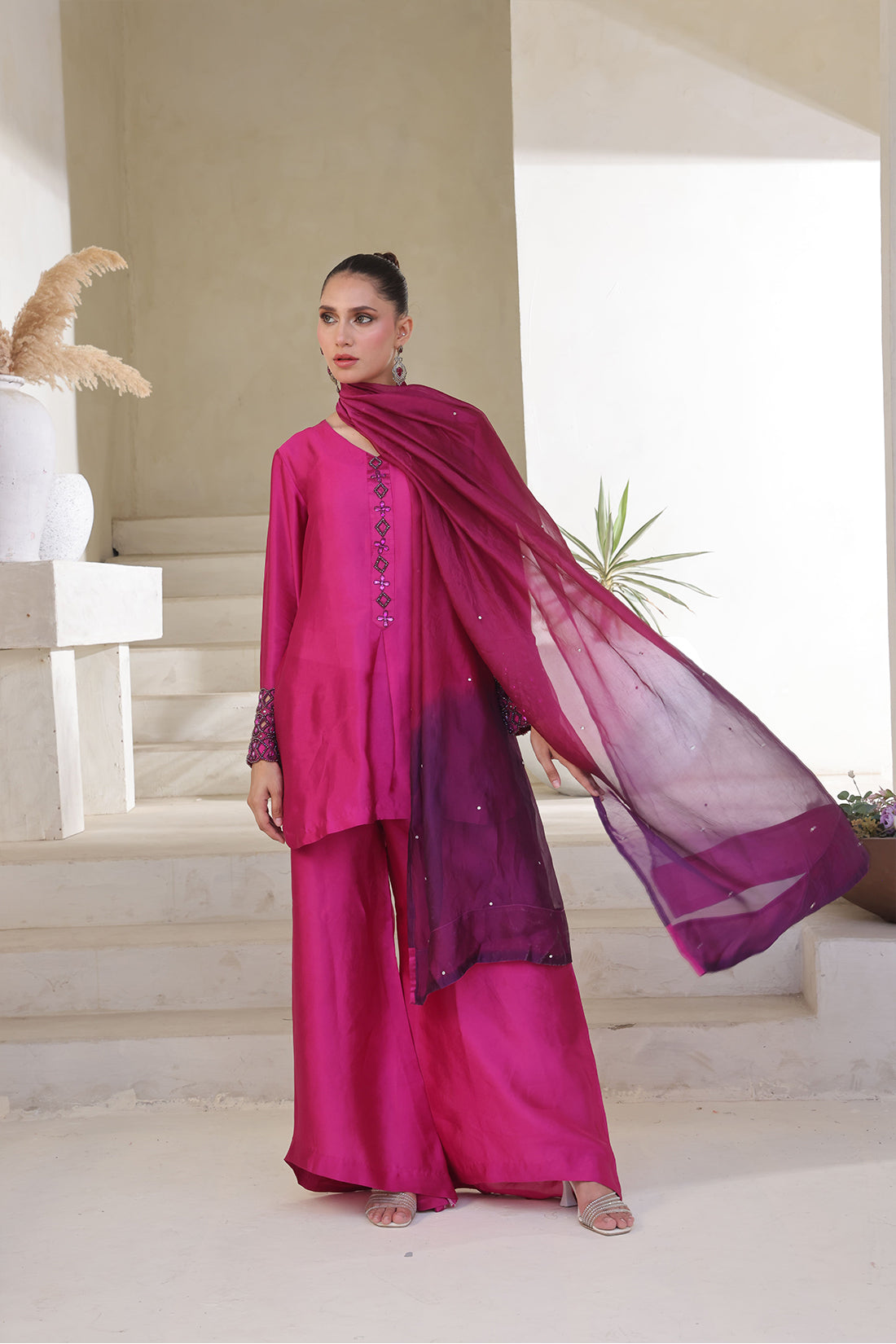 Wide-leg trousers complement the fluid silhouette, while a sheer dupatta brings the look together with quiet elegance. A modern classic for celebratory season wear.