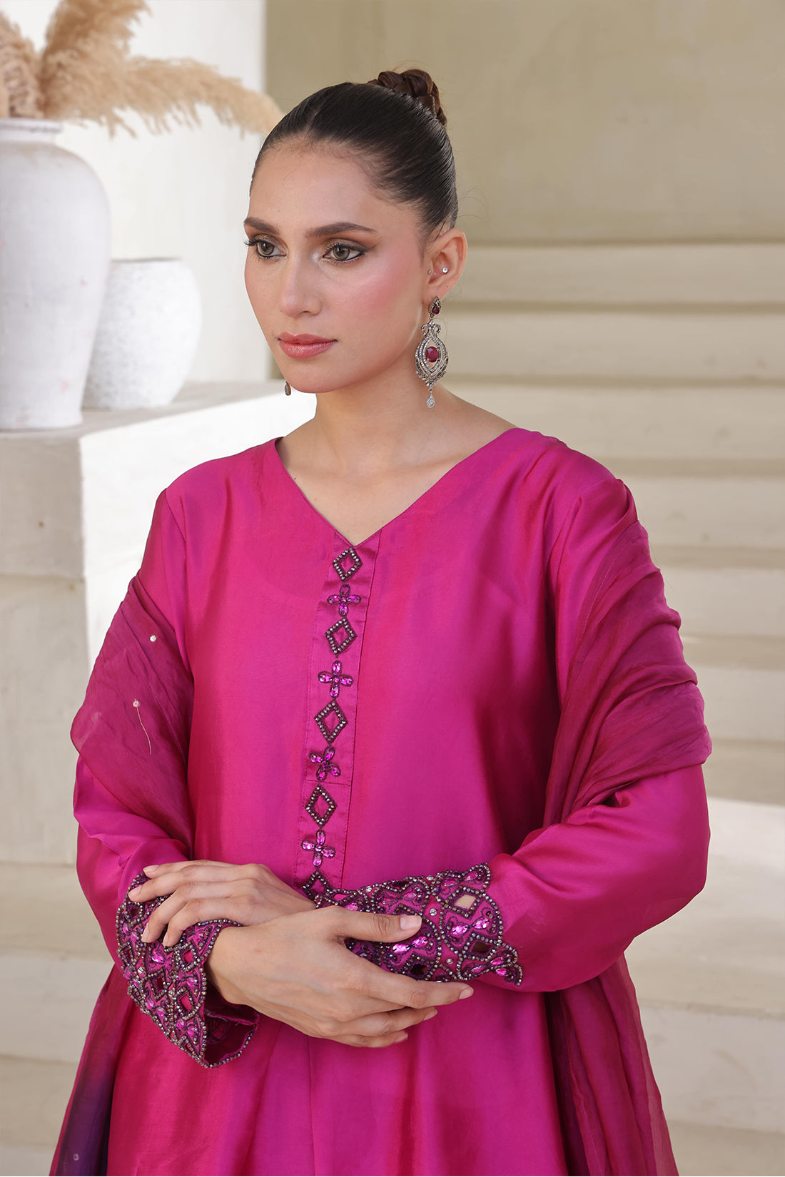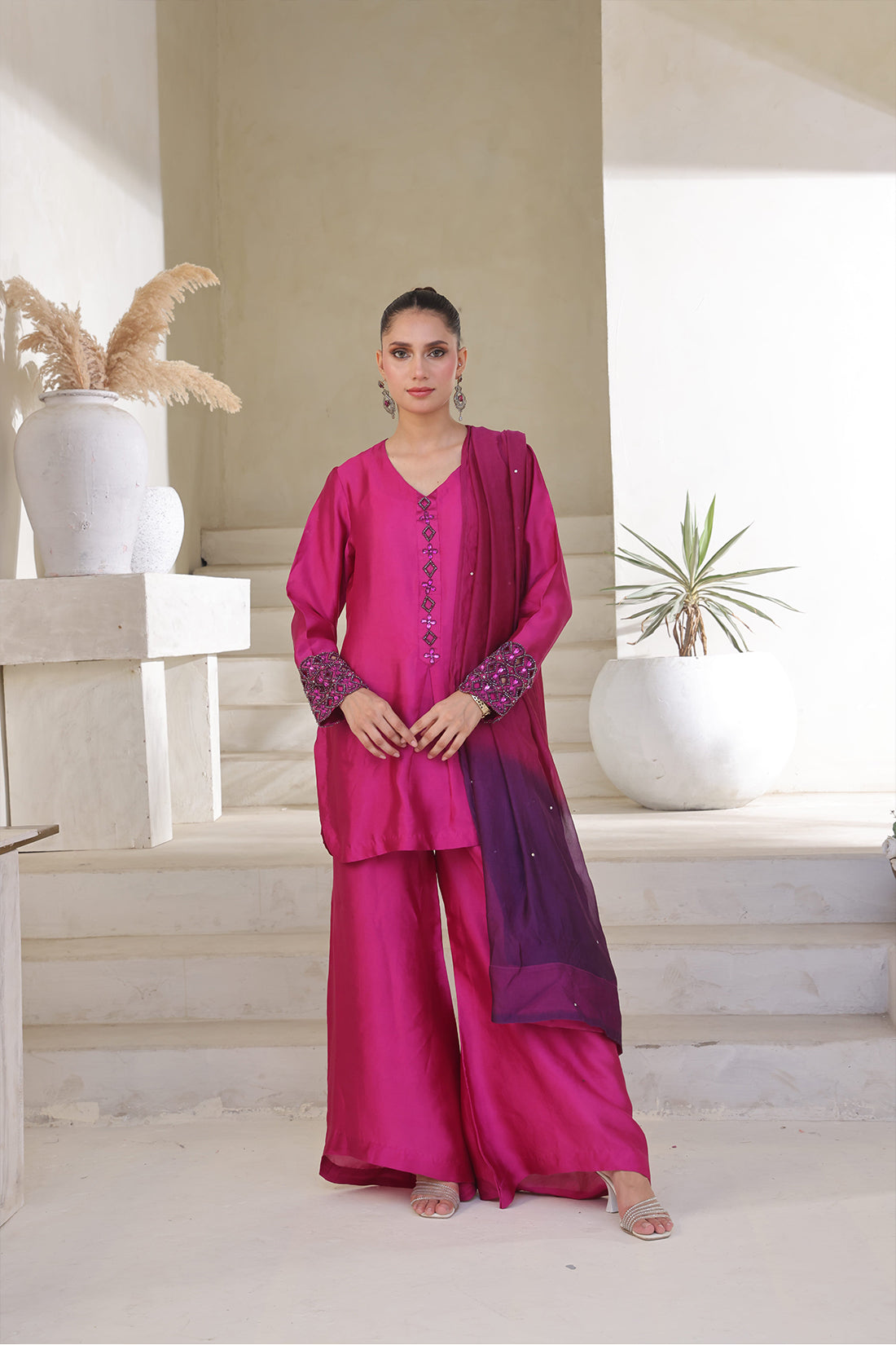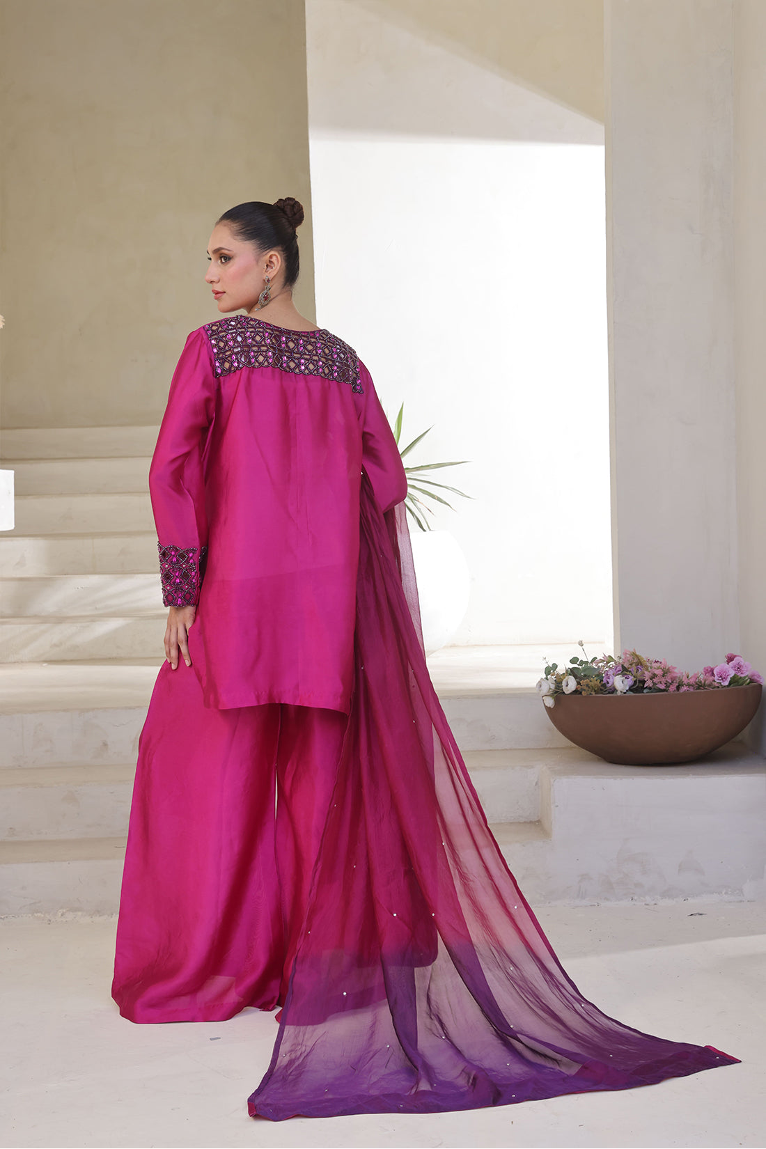 Wide-leg trousers complement the fluid silhouette, while a sheer dupatta brings the look together with quiet elegance. A modern classic for celebratory season wear.