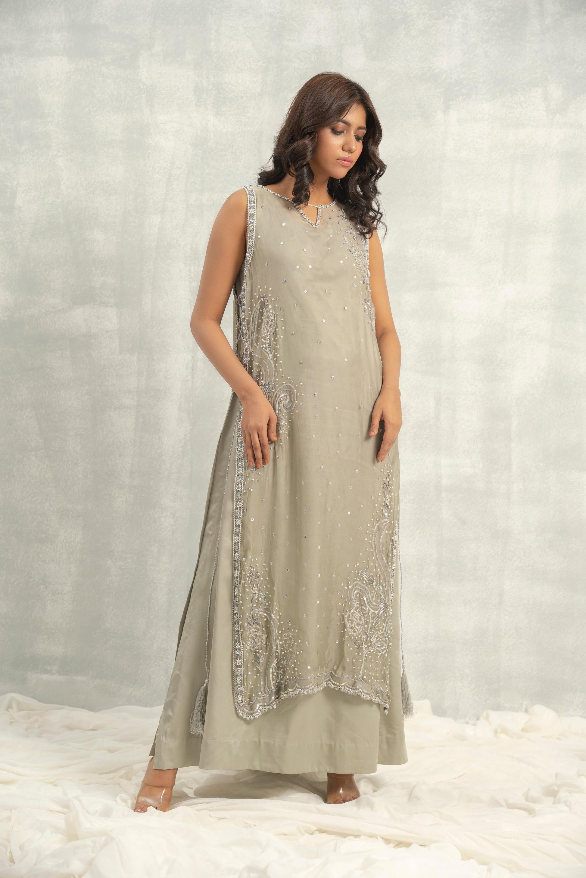 A refined grey charmeuse silk inner and pants, paired with a delicate organza shirt. The shirt is intricately crafted with handwork of sequins, dabka, pearls, and beads, adding a touch of glamour and elegance to this effortlessly chic ensemble.