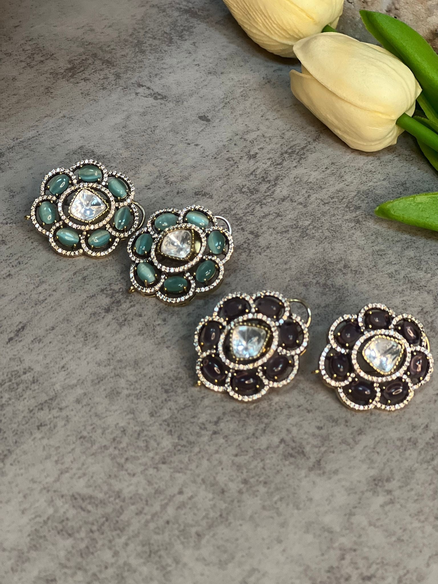 Elegant flower-inspired studs featuring sparkling crystals surrounded by vibrant green and deep purple accents. A timeless design that adds a touch of grace to any outfit.