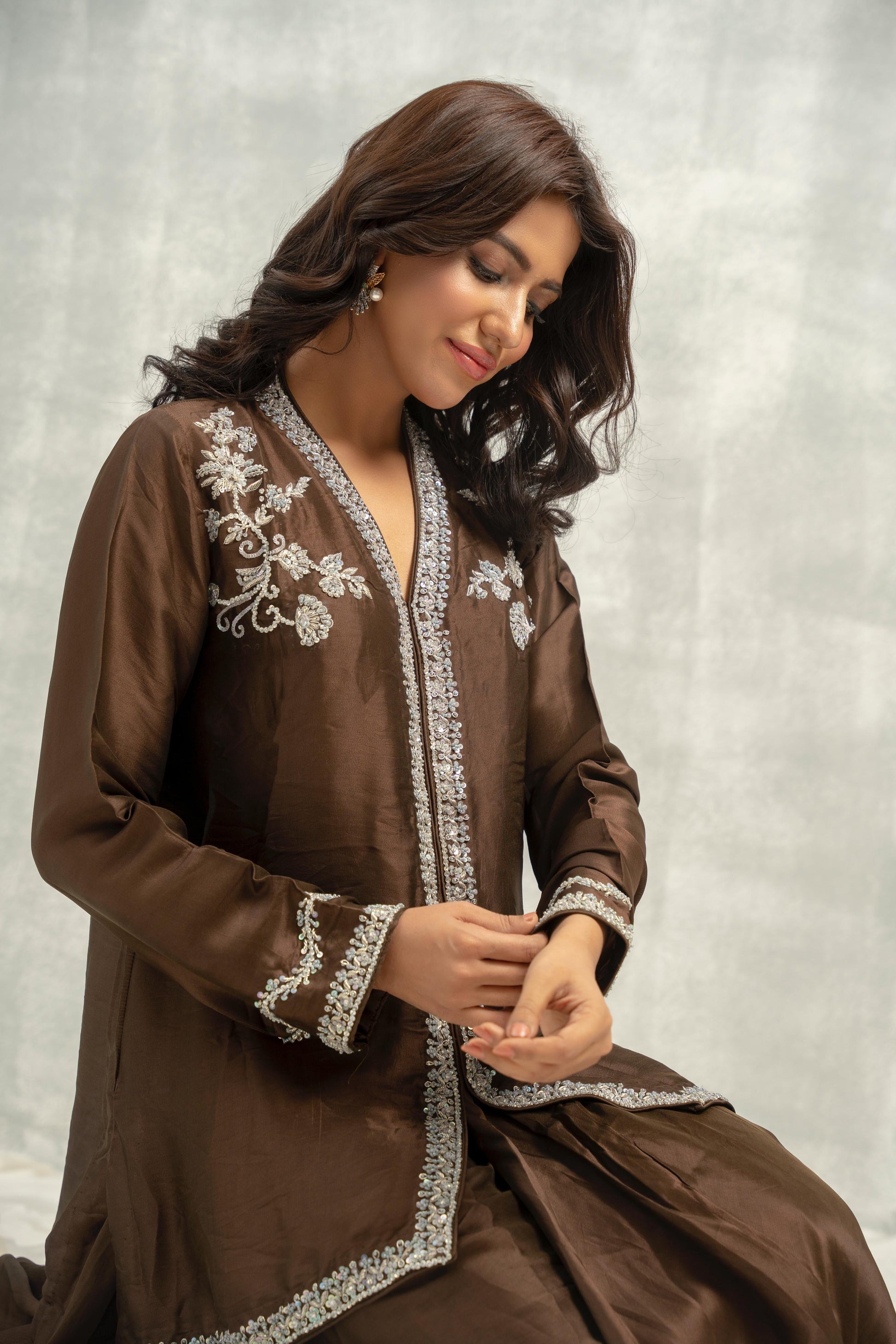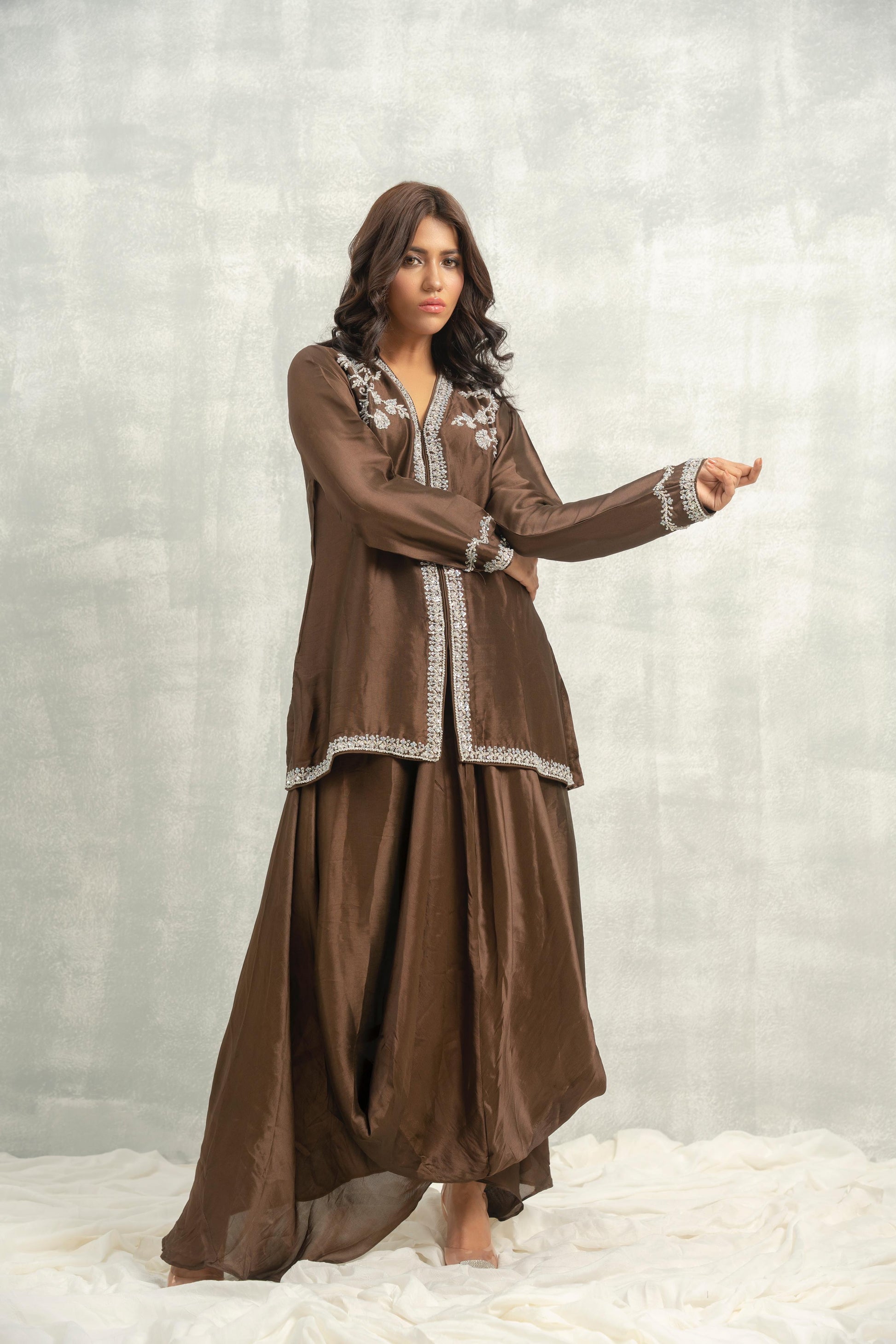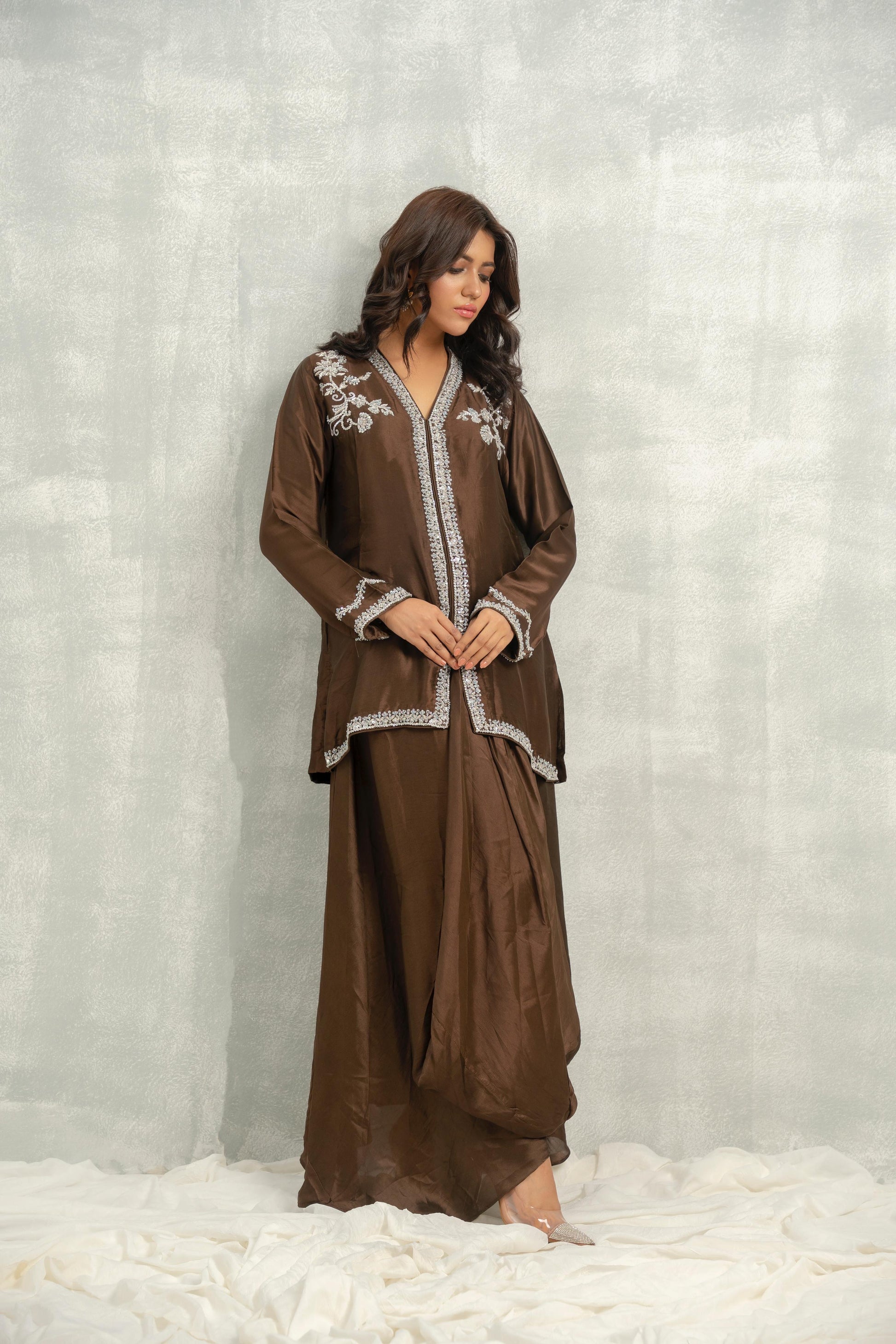 A chocolate brown butter silk ensemble featuring a draped skirt and a short, boxy-cut shirt with front-open details. Adorned with intricate handwork on the neckline and shoulders, it seamlessly blends opulence with modern elegance, making it a versatile choice for festive occasions.
