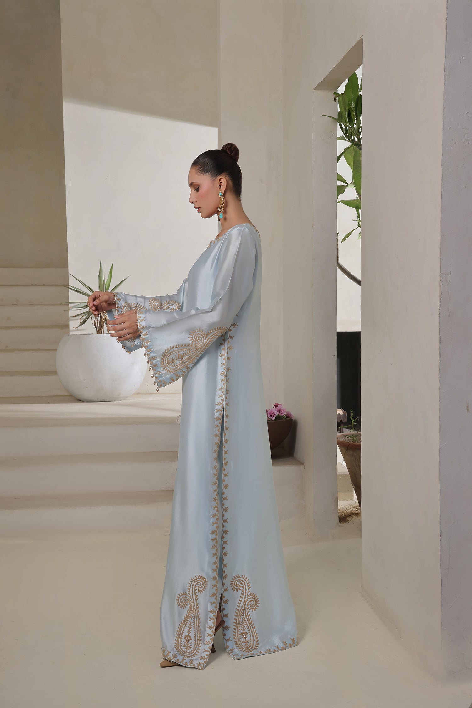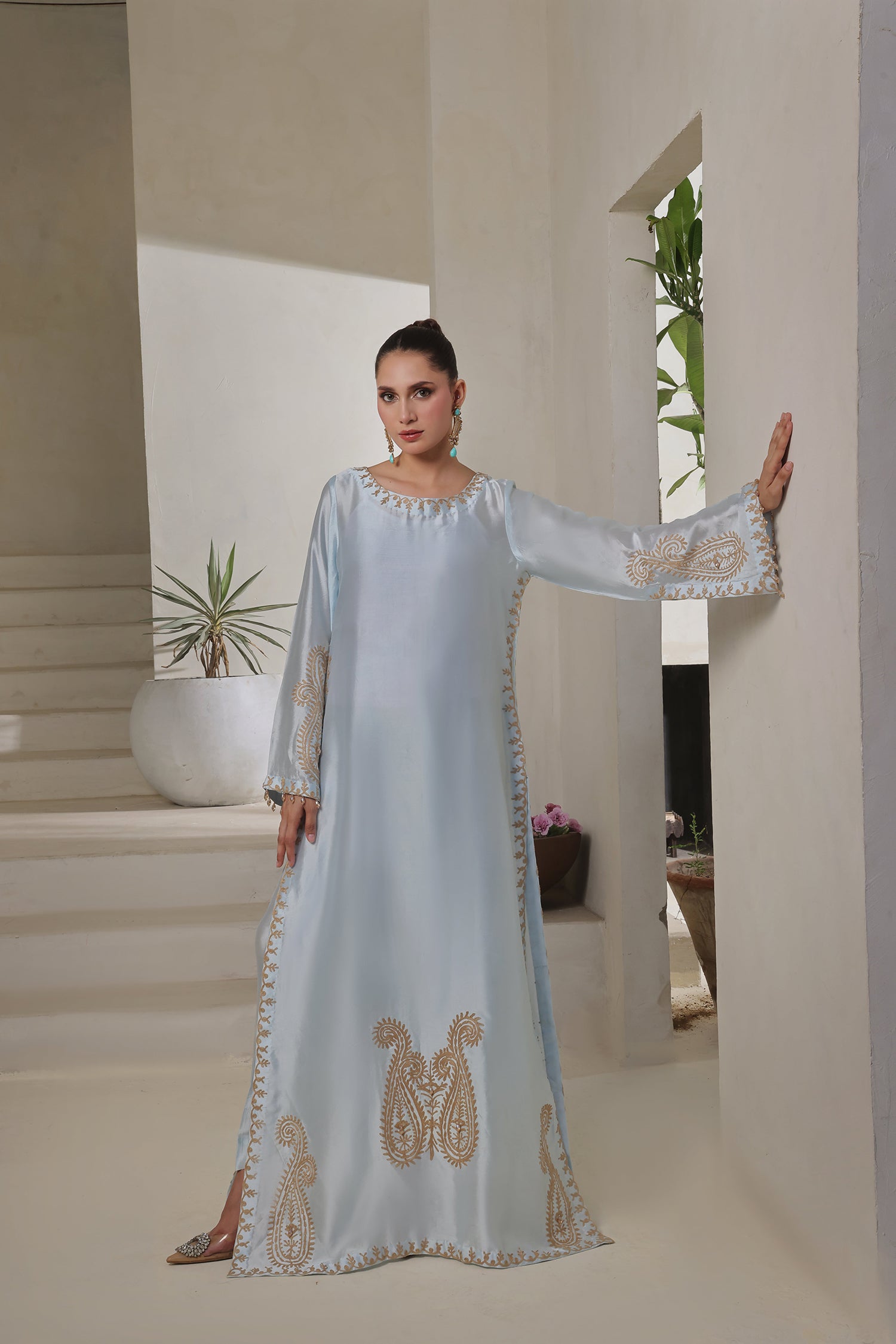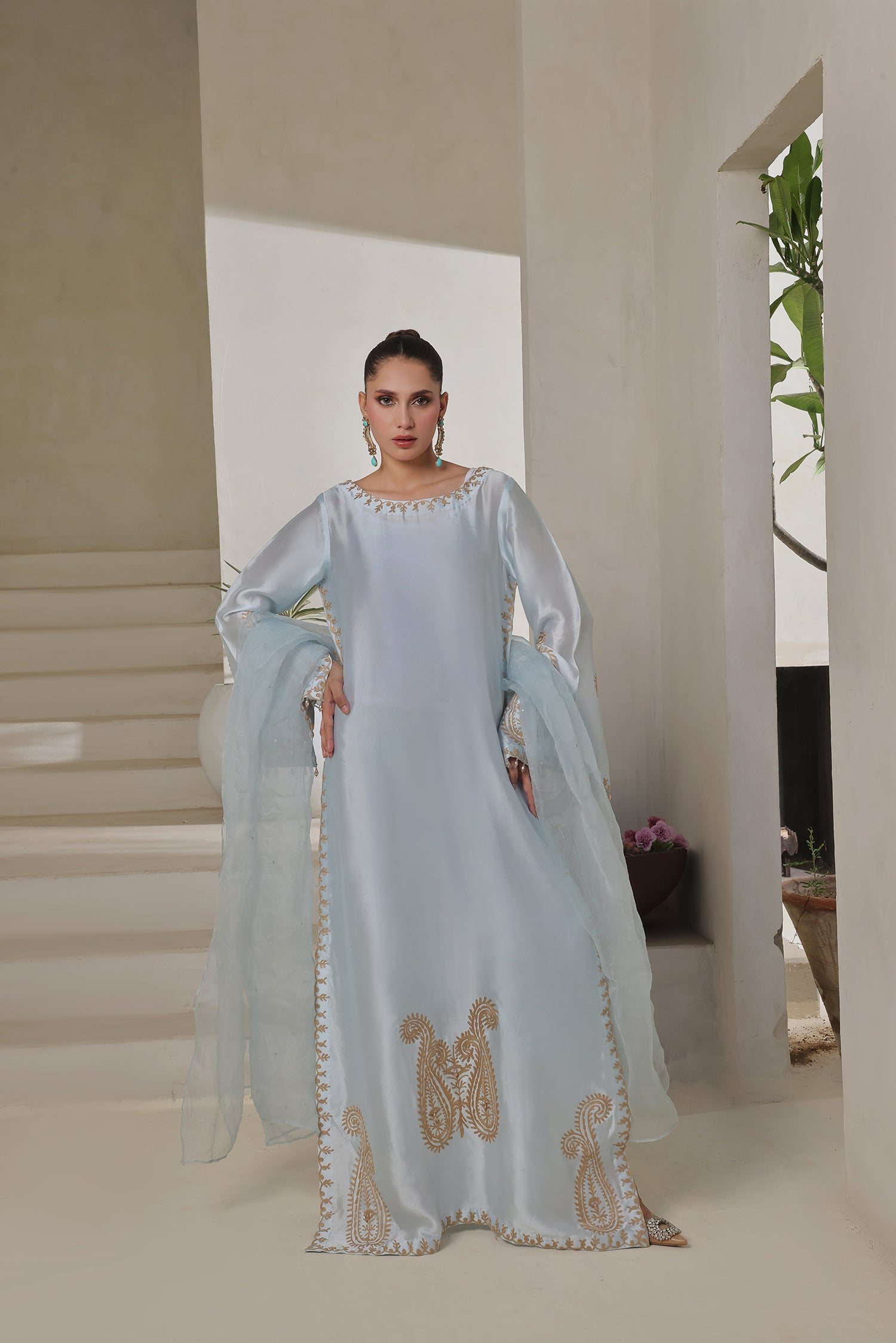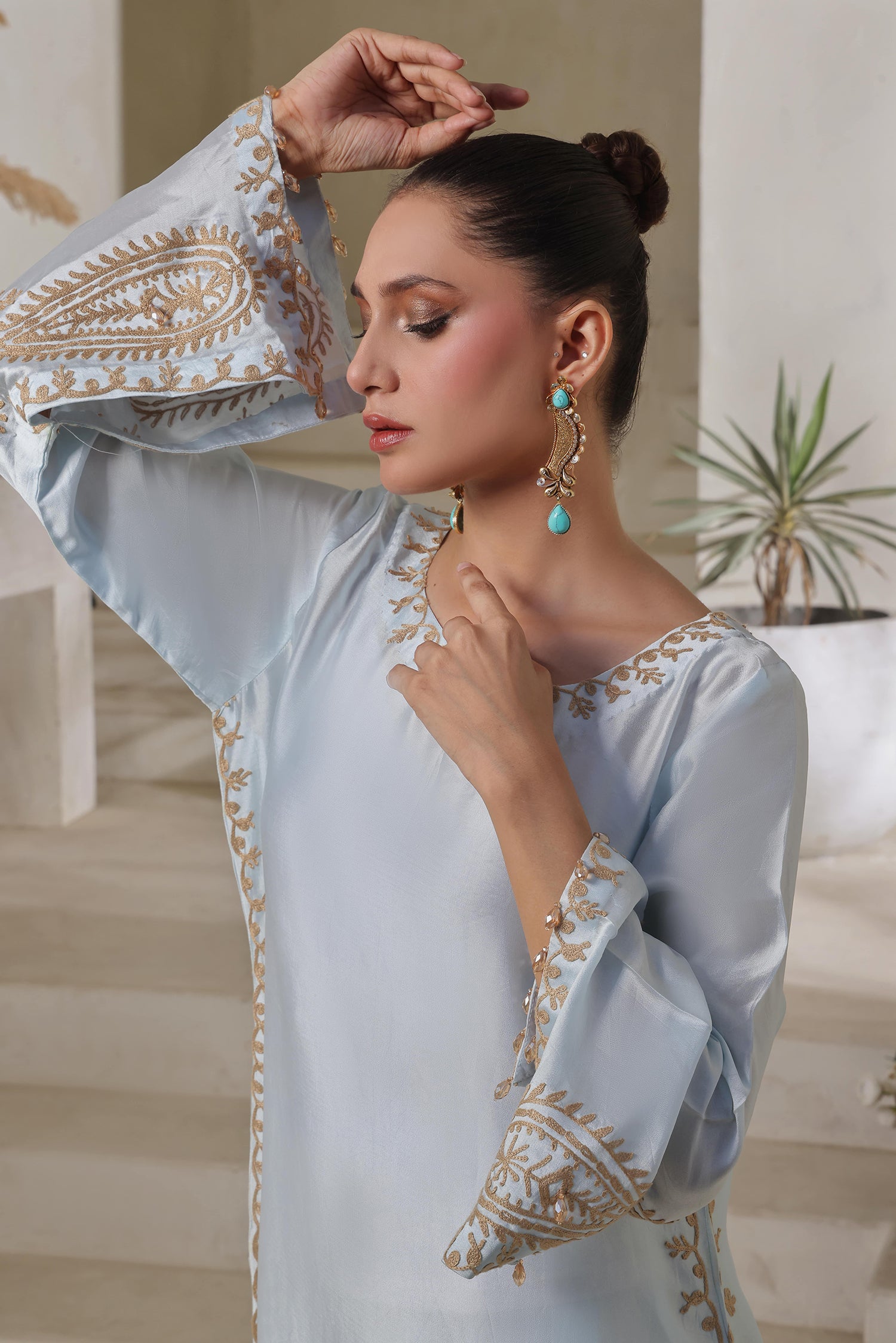 In a serene powder blue that evokes calm skies and quiet confidence, this long shirt is crafted in luxurious buttersilk that glides effortlessly over the skin. The silhouette is tailored yet fluid, designed to flatter without overpowering.