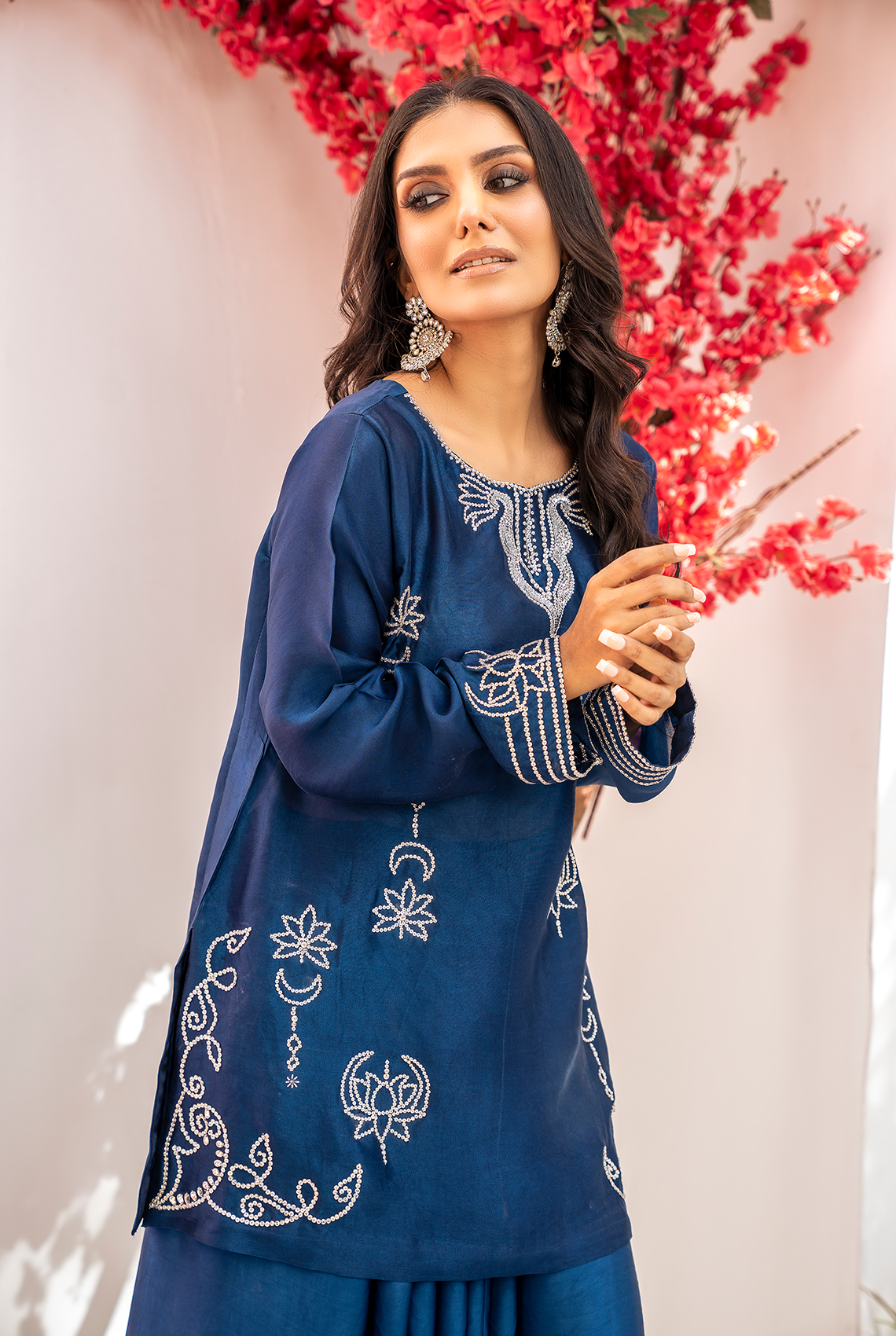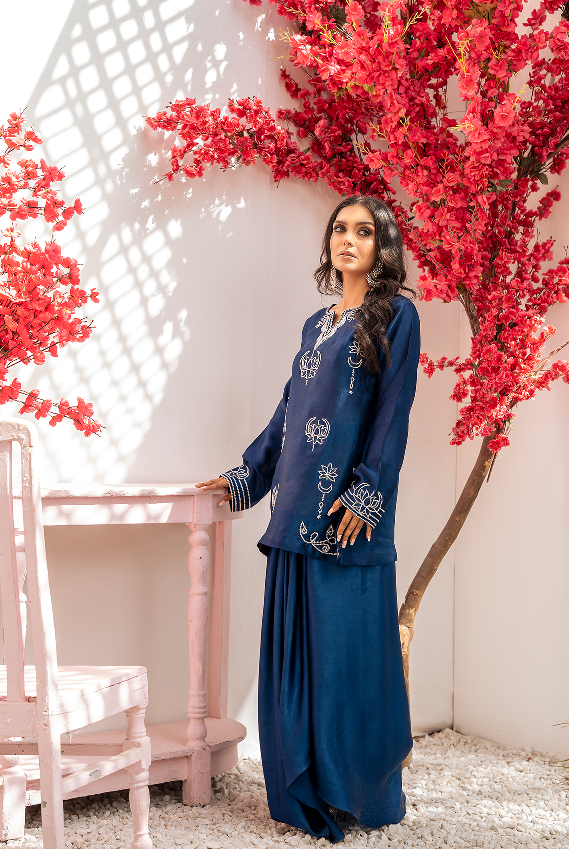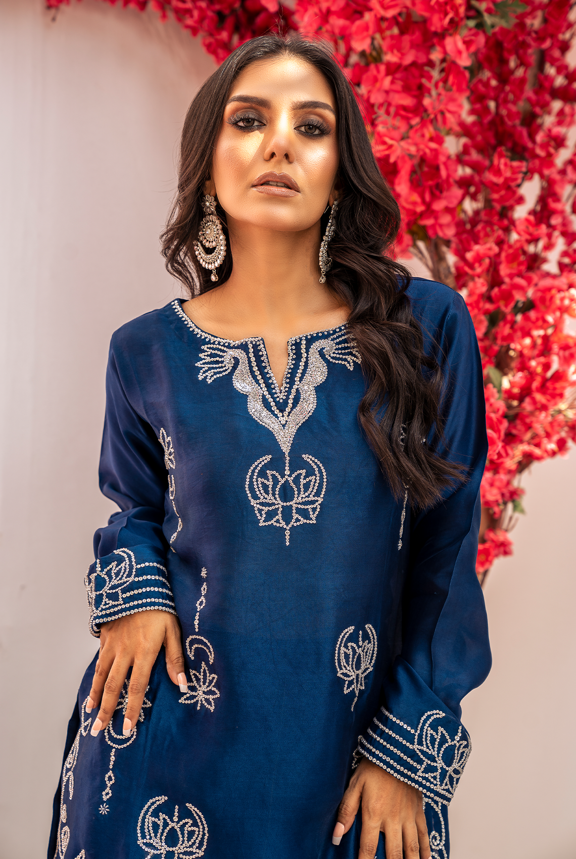 Chic and timeless, this deep navy blue ensemble is a true statement piece. The short sheesha silk shirt is adorned with intricate handwork of diamanté, beads, and sequins, beautifully designed in lotus and peacock motifs. Paired with a gracefully draped shalwar in charmeuse silk, this outfit blends classic charm with modern sophistication, perfect for any elegant occasion.
