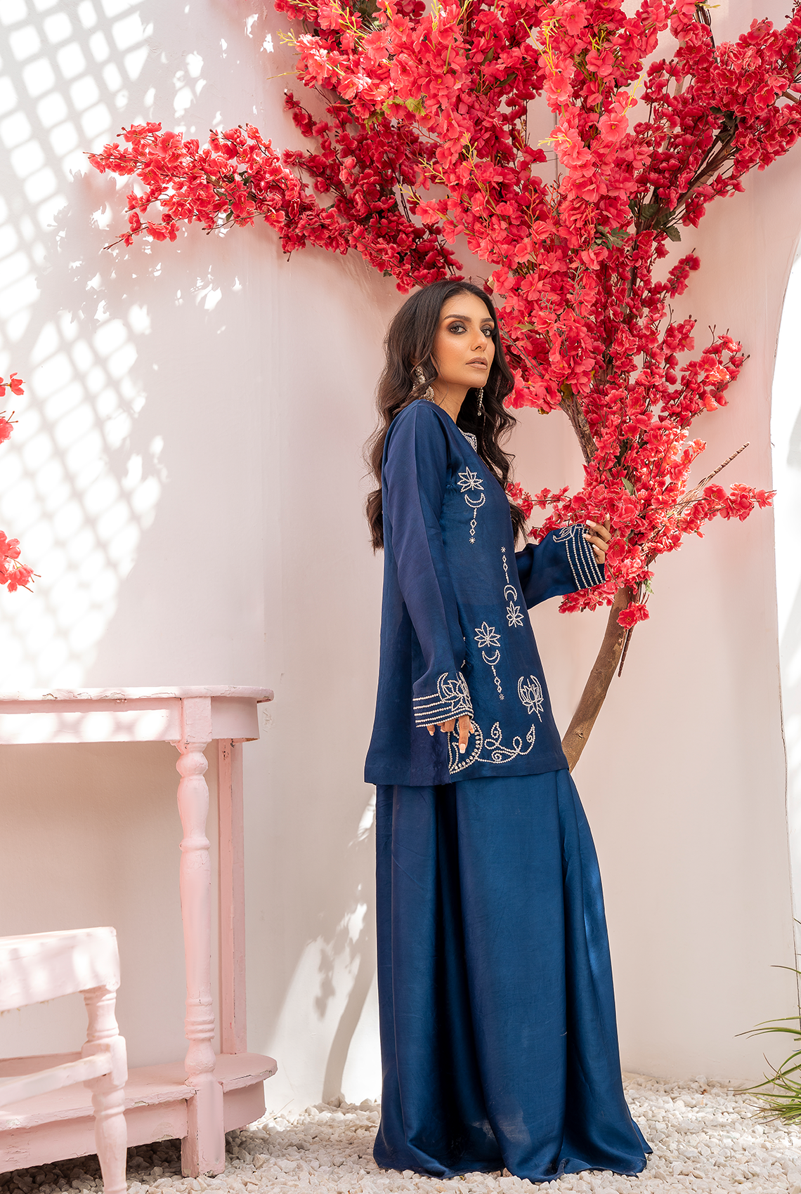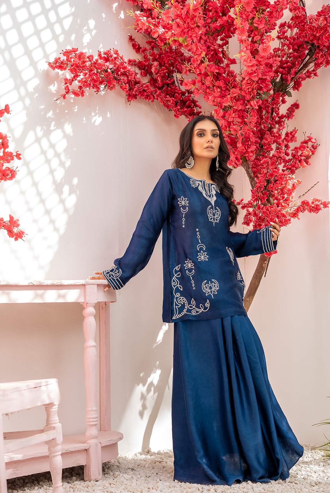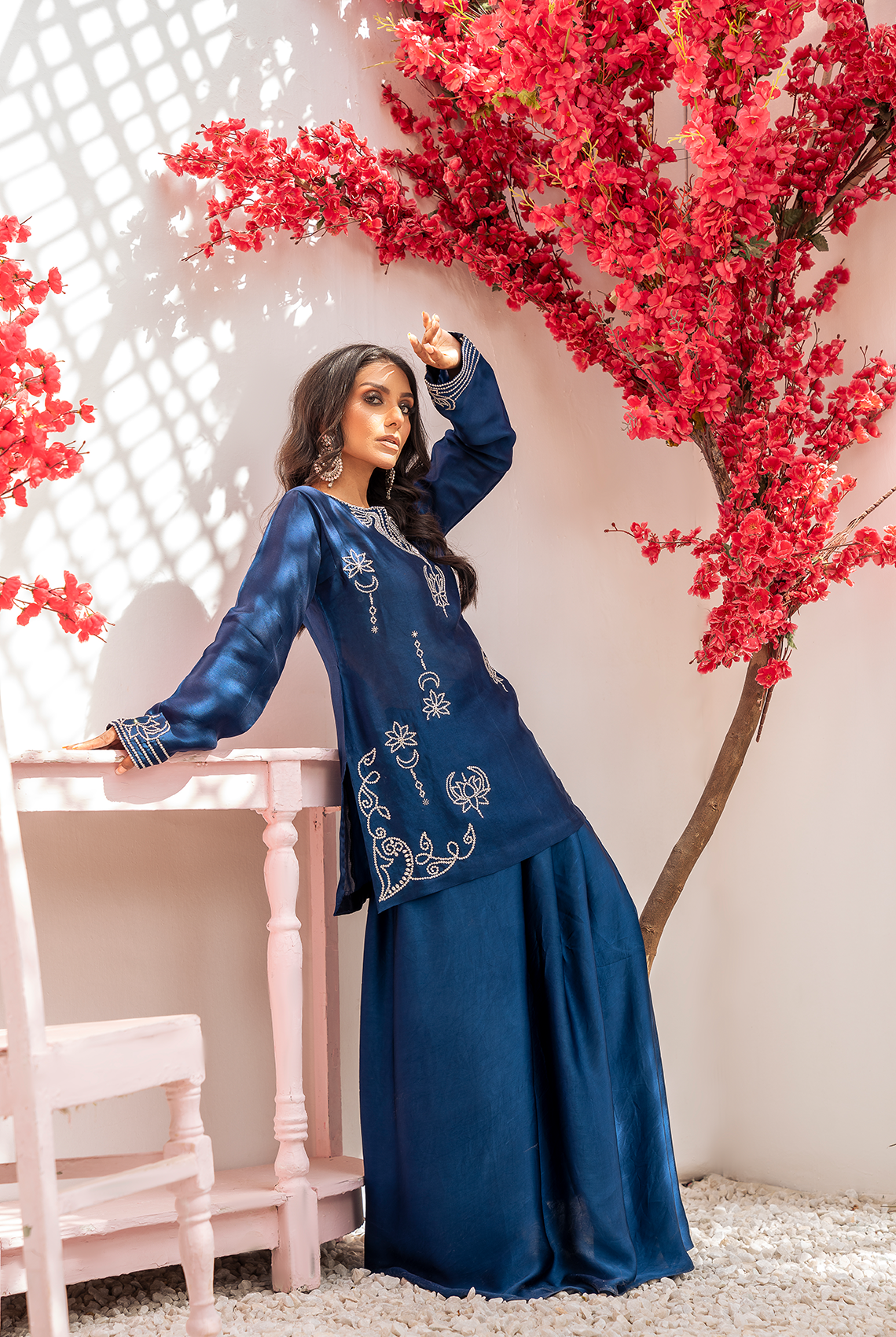 Chic and timeless, this deep navy blue ensemble is a true statement piece. The short sheesha silk shirt is adorned with intricate handwork of diamanté, beads, and sequins, beautifully designed in lotus and peacock motifs. Paired with a gracefully draped shalwar in charmeuse silk, this outfit blends classic charm with modern sophistication, perfect for any elegant occasion.