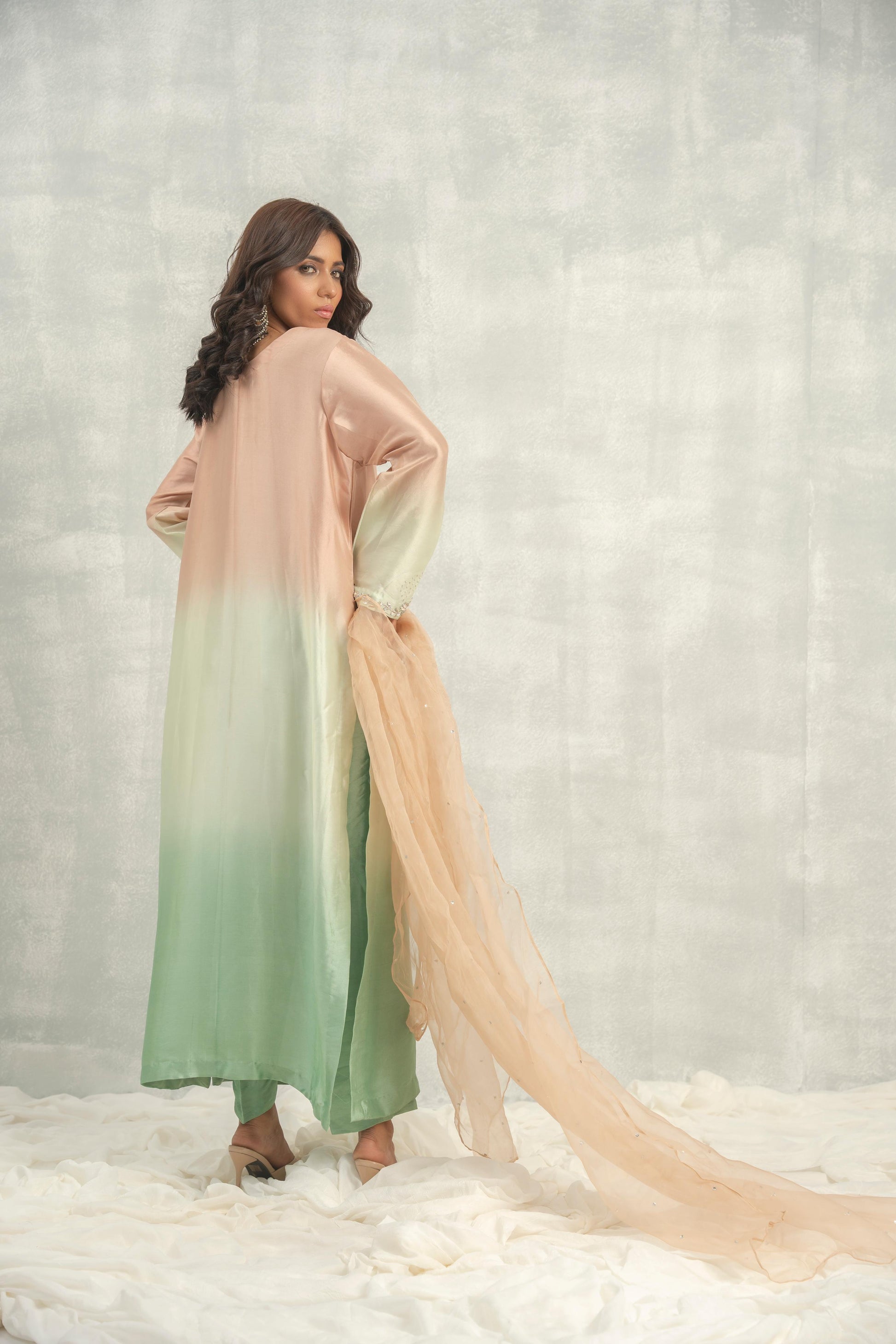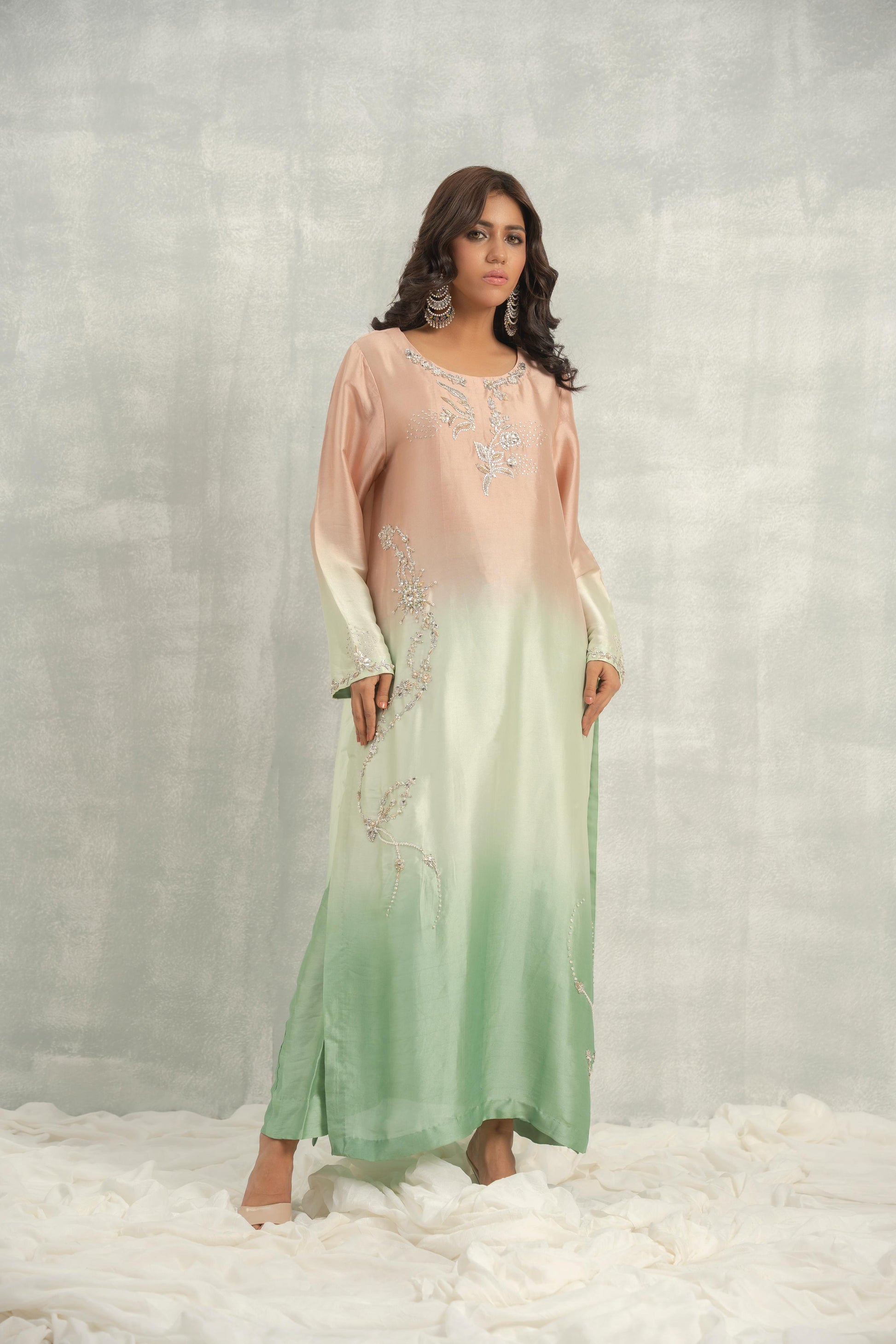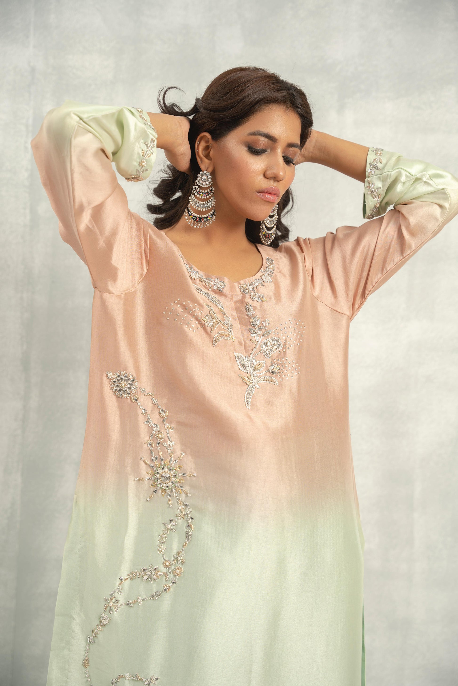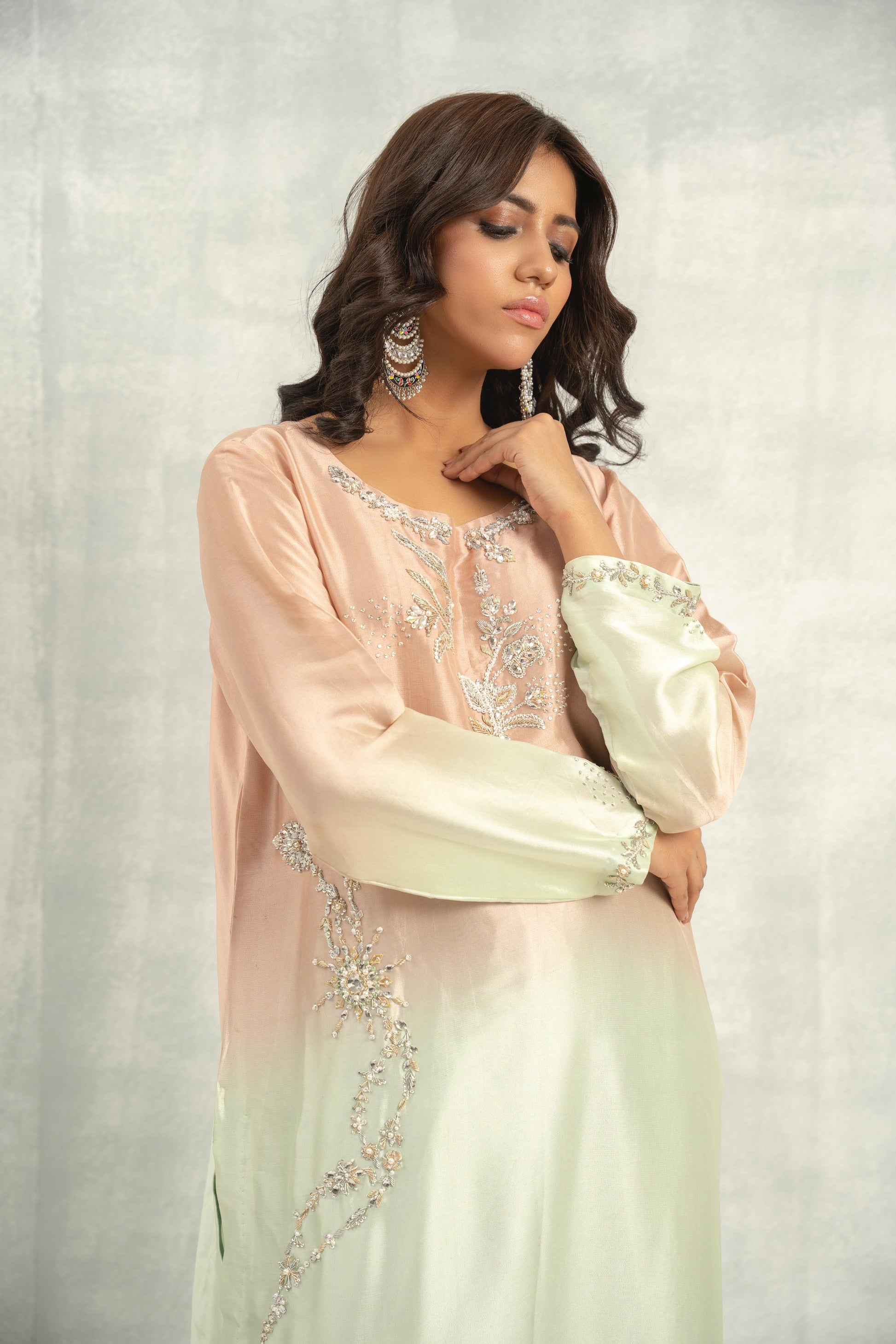 A dip-dyed butter silk outfit featuring intricate aari work details all over, enhanced with dabka, sequins, diamante, and pearls. This stunning ensemble combines luxurious fabric with exquisite craftsmanship, creating a perfect balance of modern elegance and traditional artistry.