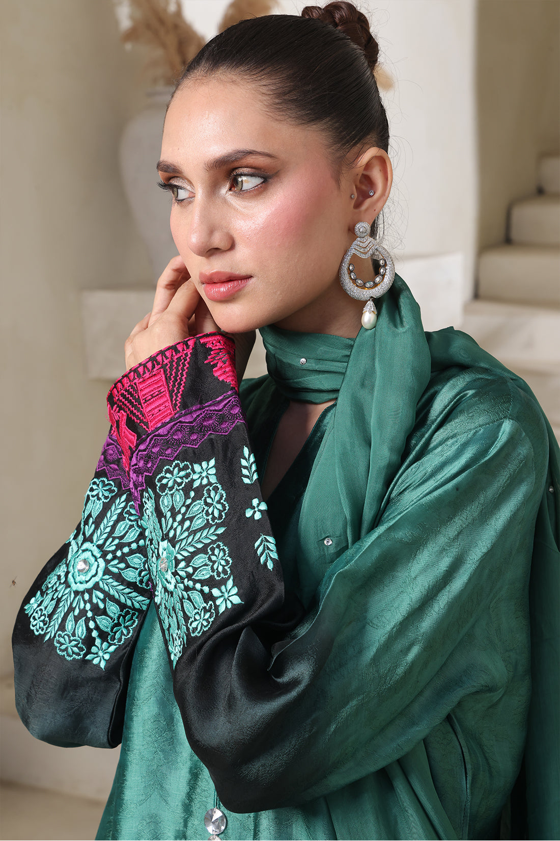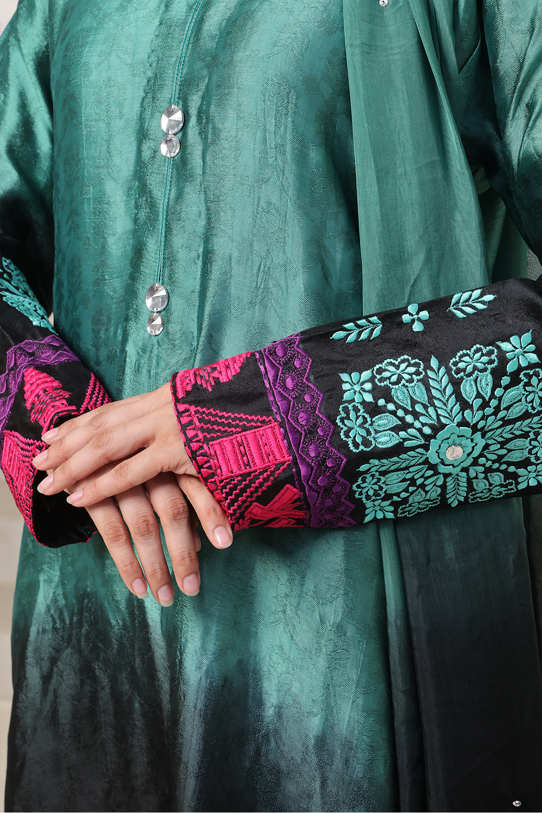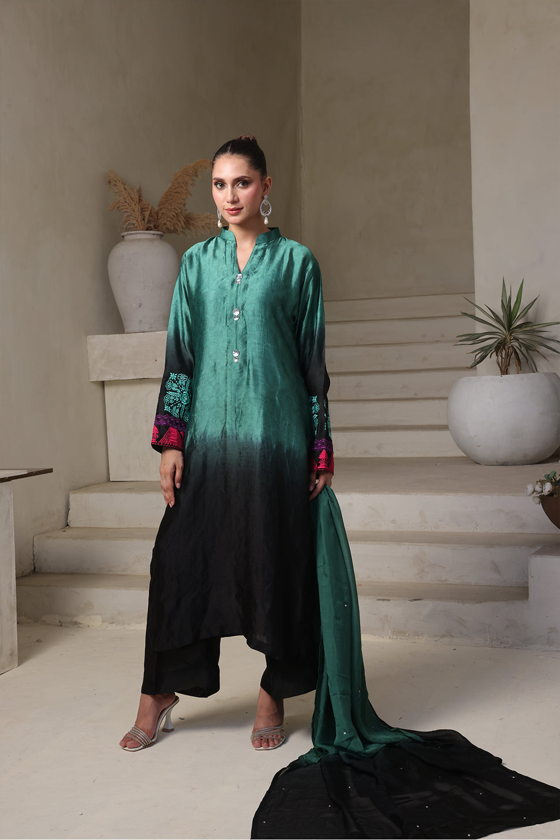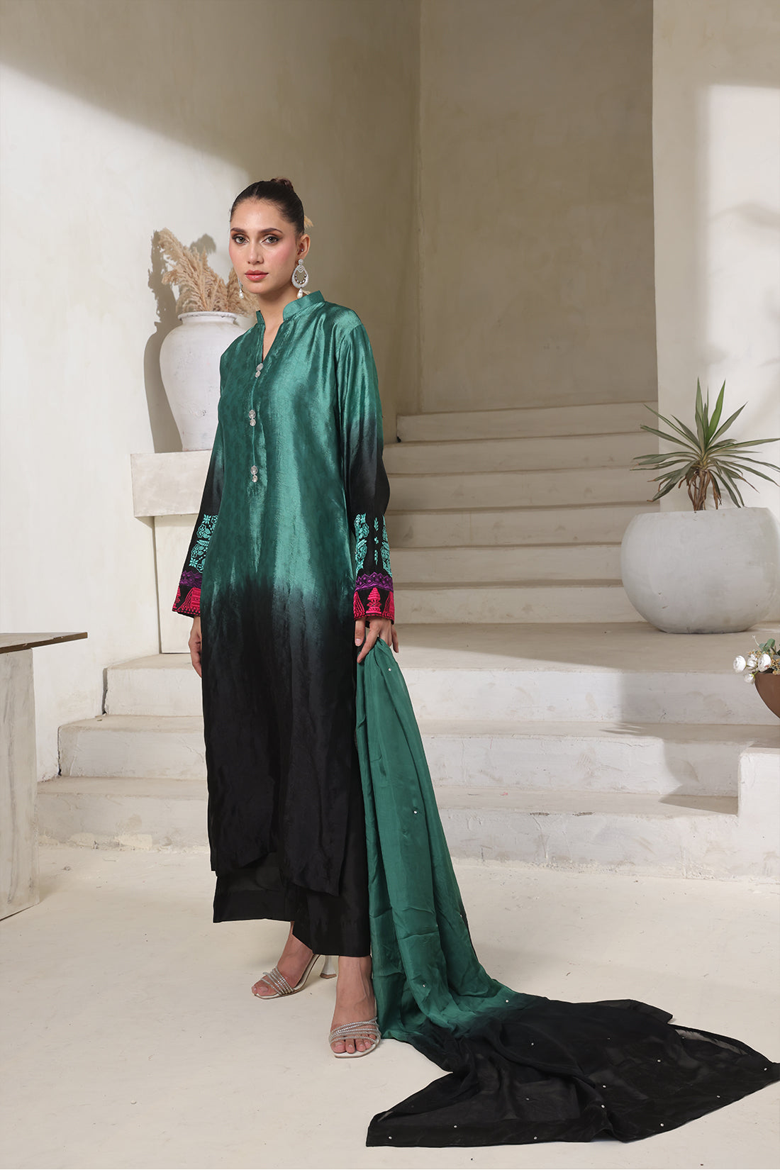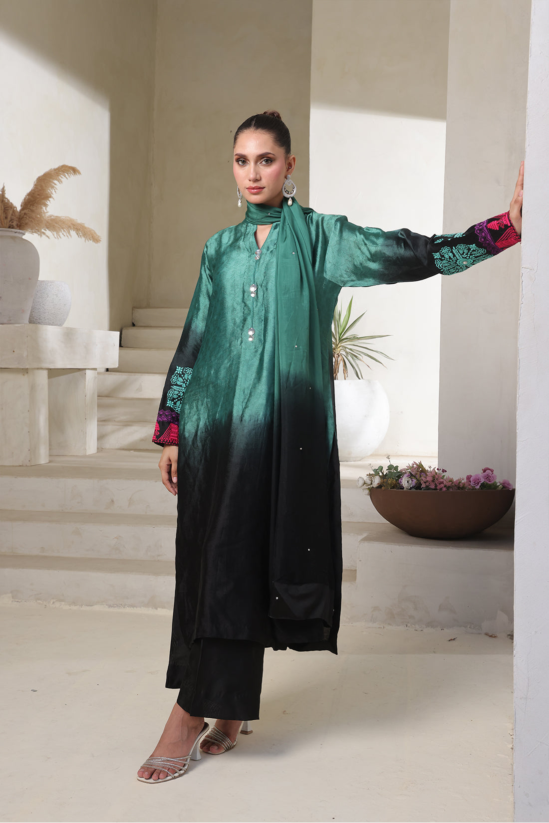A bold take on classic craft, this 3-piece set is cut from khaadi silk in a soft bottle green ombré. The shirt is framed with contrast embroidery that brings definition to the fluid gradient, offering a refined edge.