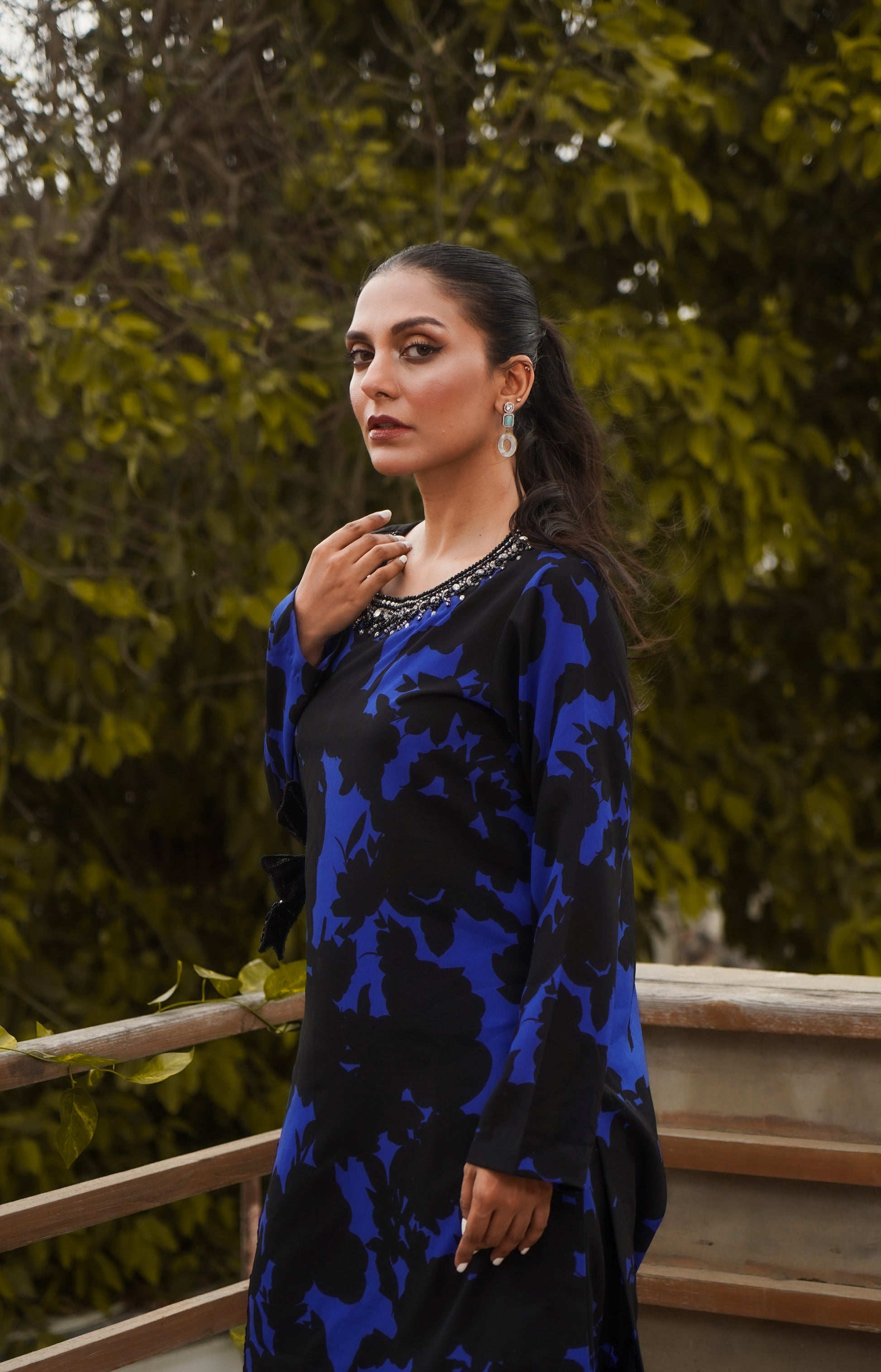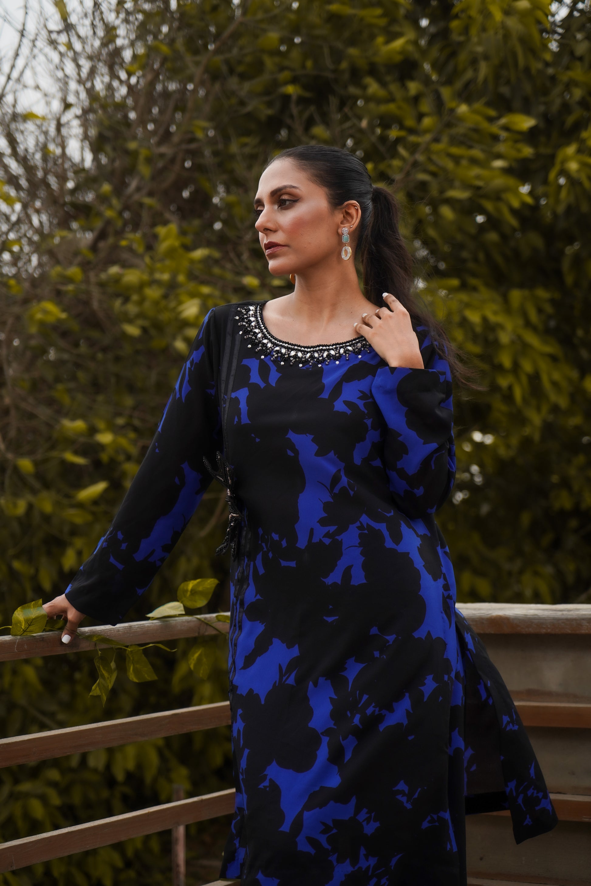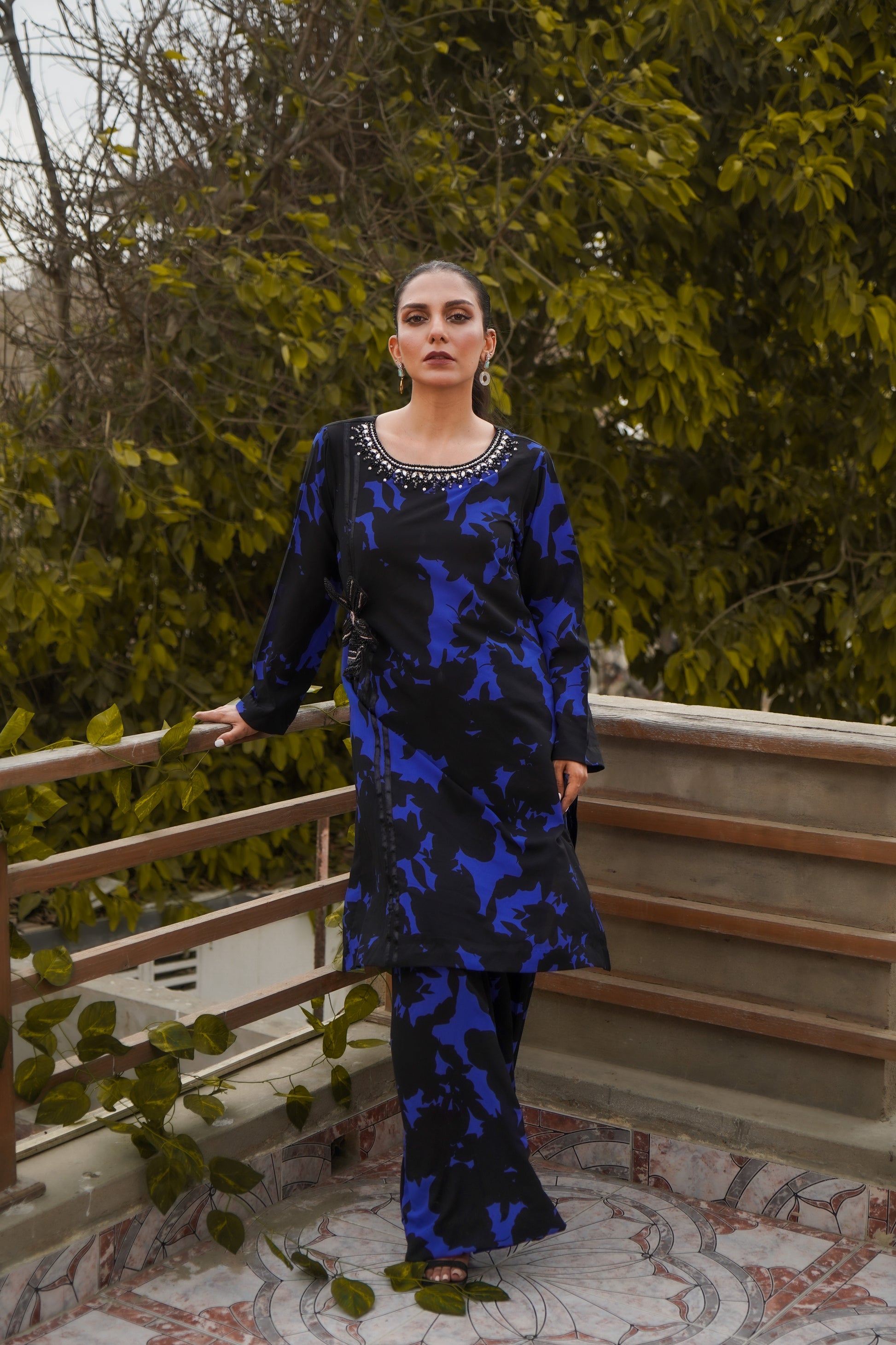This sophisticated ensemble features a georgette printed shirt adorned with intricate floral patterns and delicate diamonte embellishments. The shirt is paired with high-waisted flared pants thaand refined design elements results in a versatile piece suitable for both formal and casual occasions. Create a flattering and contemporary silhouette. The combination of luxurious fabrics.