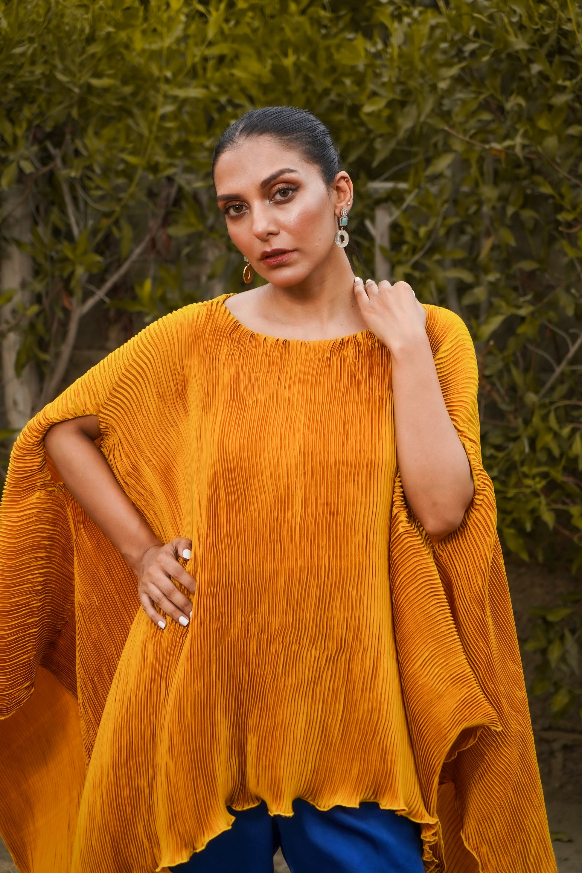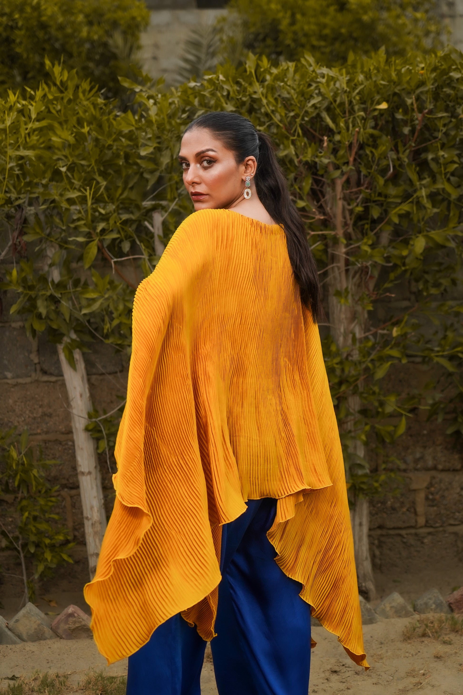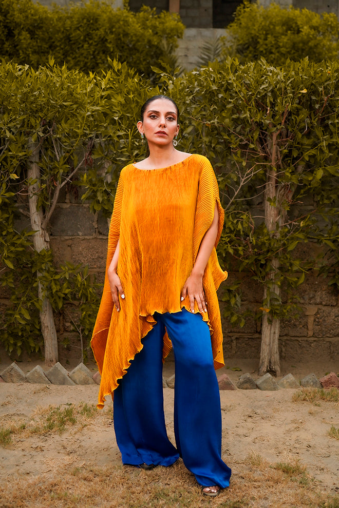 Experience effortless elegance with our Mustard Pleated Silk Cape, featuring a relaxed fit and peekaboo sleeves. Paired with striking contrast Cobalt Wide-Leg Pants, this ensemble combines luxuriously playful feel with modern flair, perfect for a chic day-to-night look.