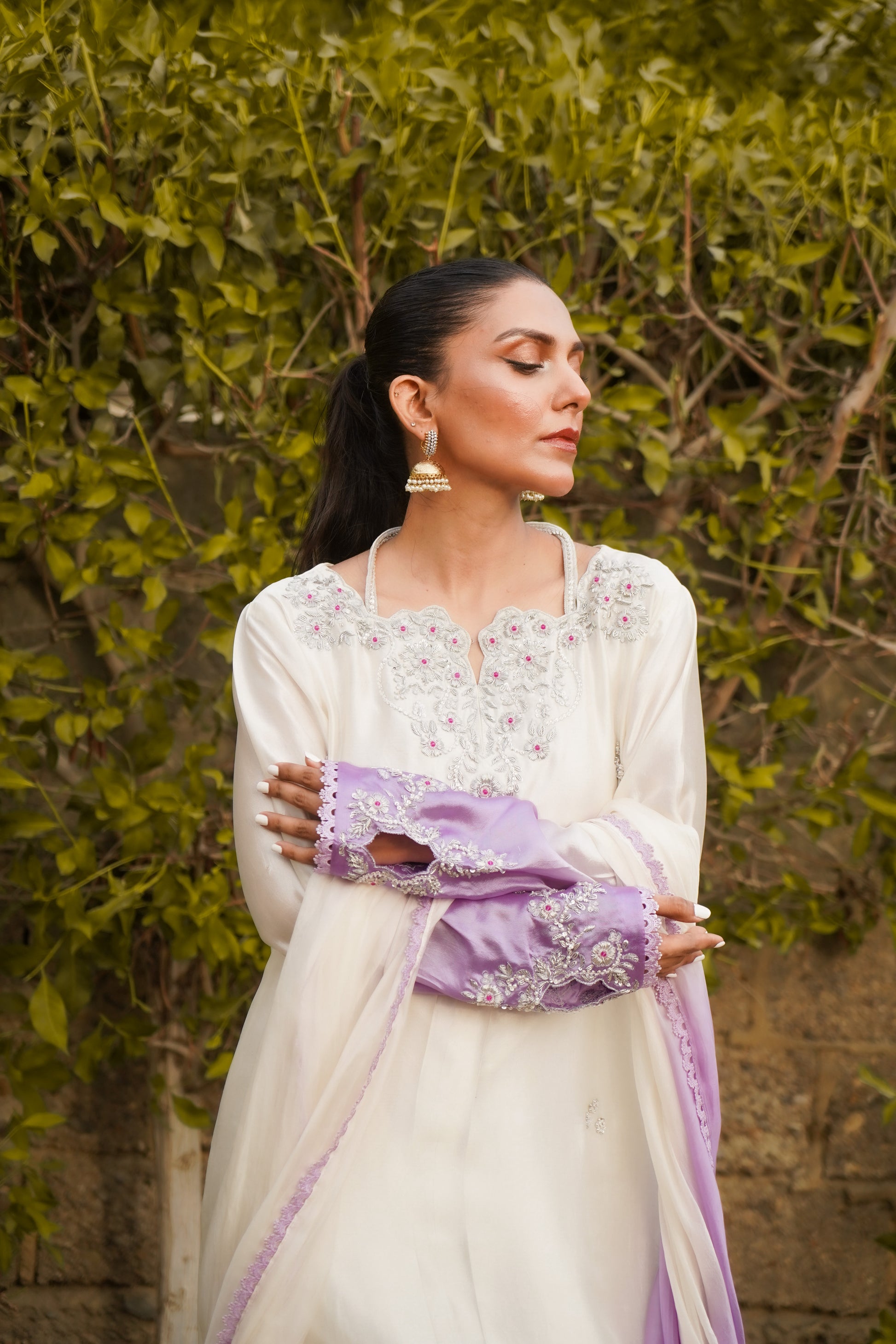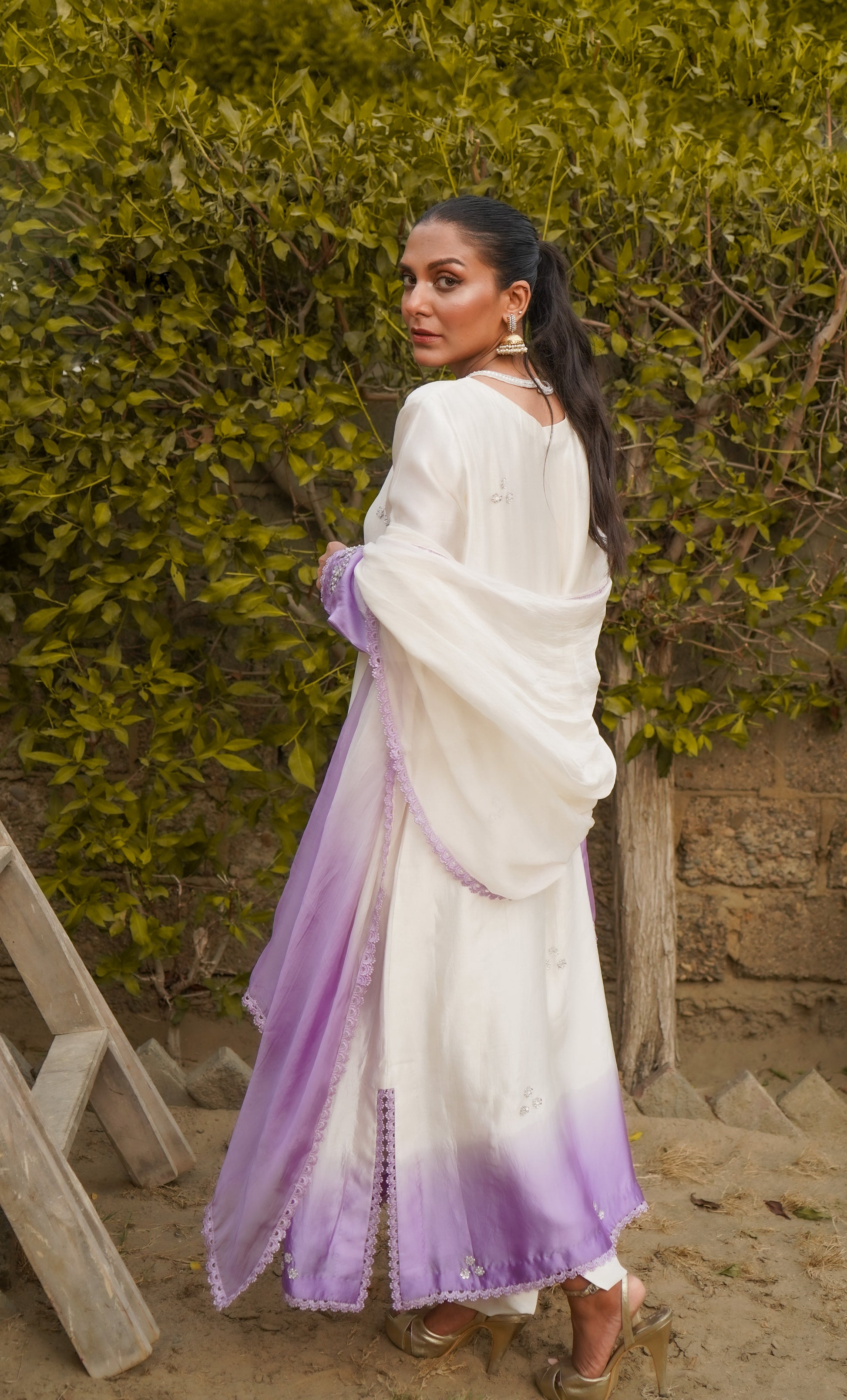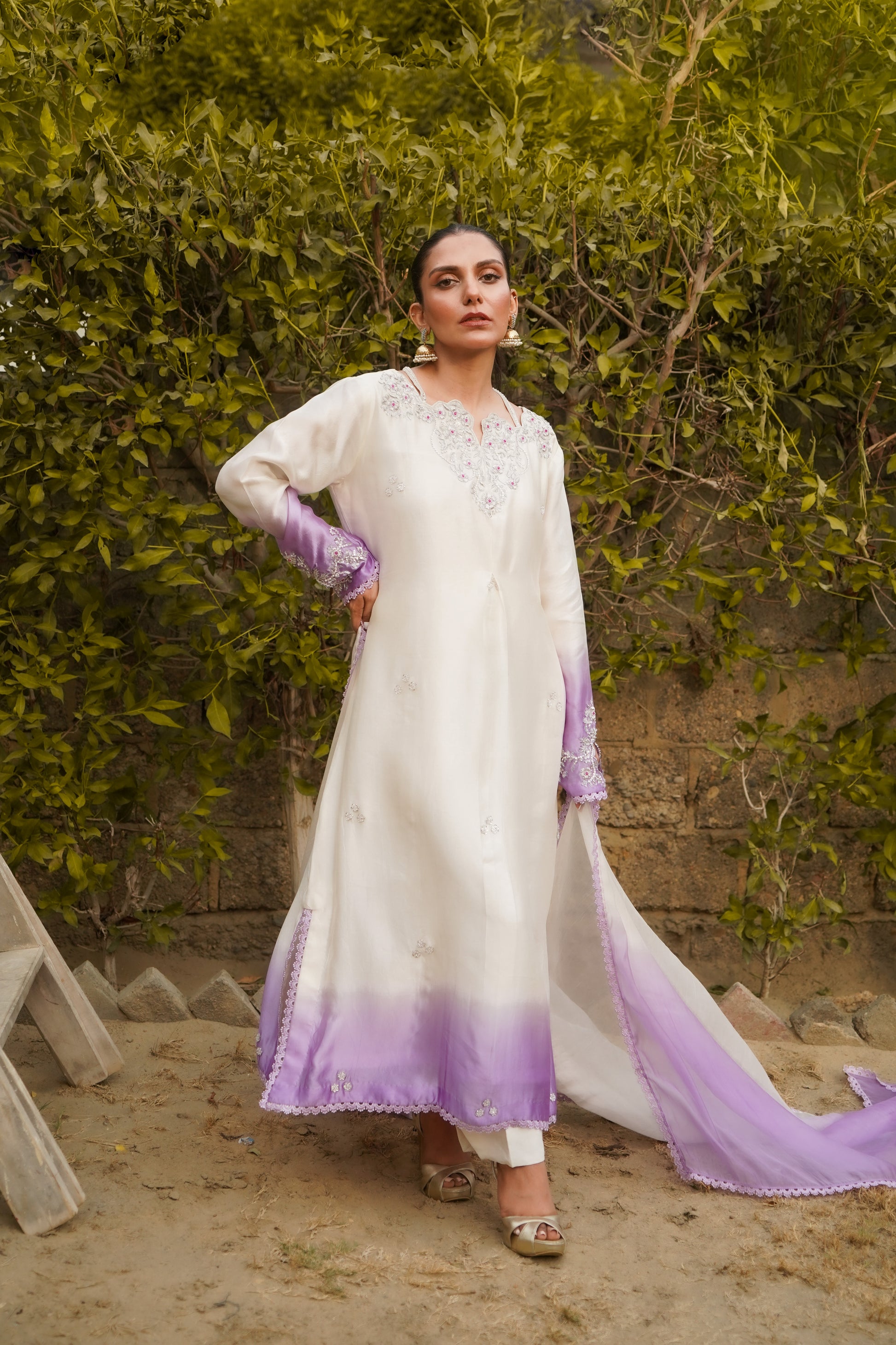 Pure silk ensemble featuring a long shirt with a captivating blend of white and lavender hues. Intricate strap detailing at the neckline and lavish embellishments throughout create a mesmerizing masterpiece. The accompanying slit-hem pants offer a contemporary twist to the classic silhouette. To complete this luxurious look, a delicate dupatta adorned with lace and subtle motifs adds a touch of sophistication.
