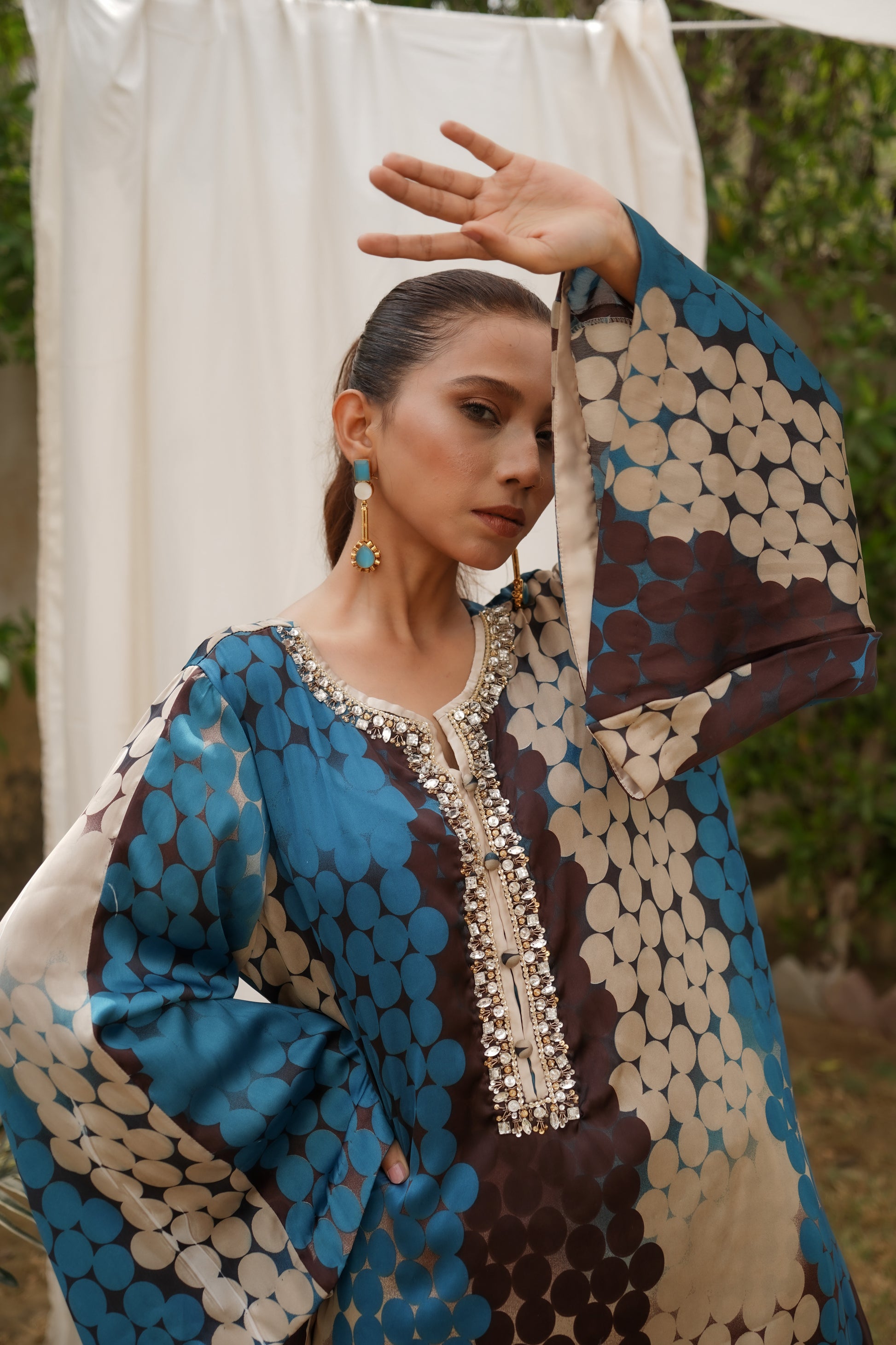 This exquisite silk shirt features a stunning print and intricate neckline embellishments. The flared sleeves add a touch of drama to this elegant piece. Crafted from the finest silk, this shirt offers unparalleled comfort and luxury.