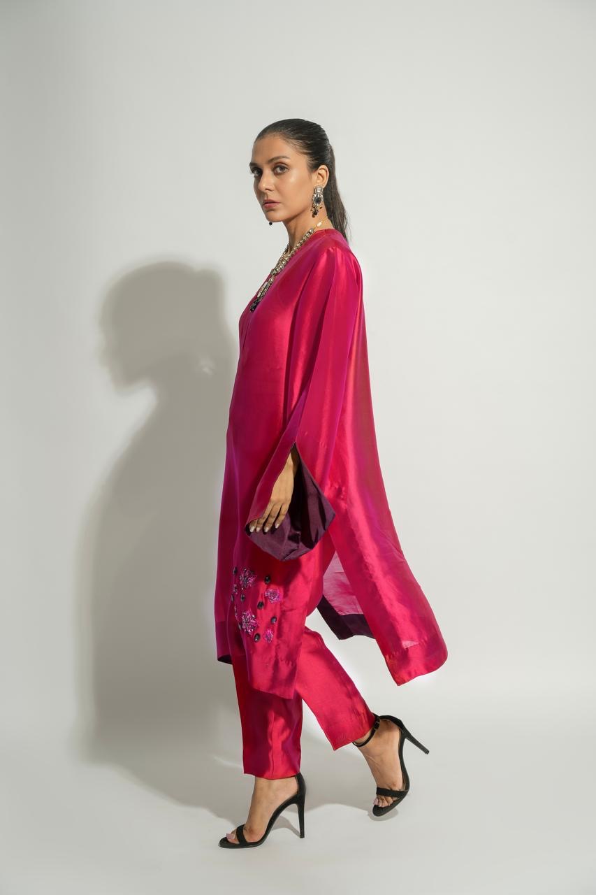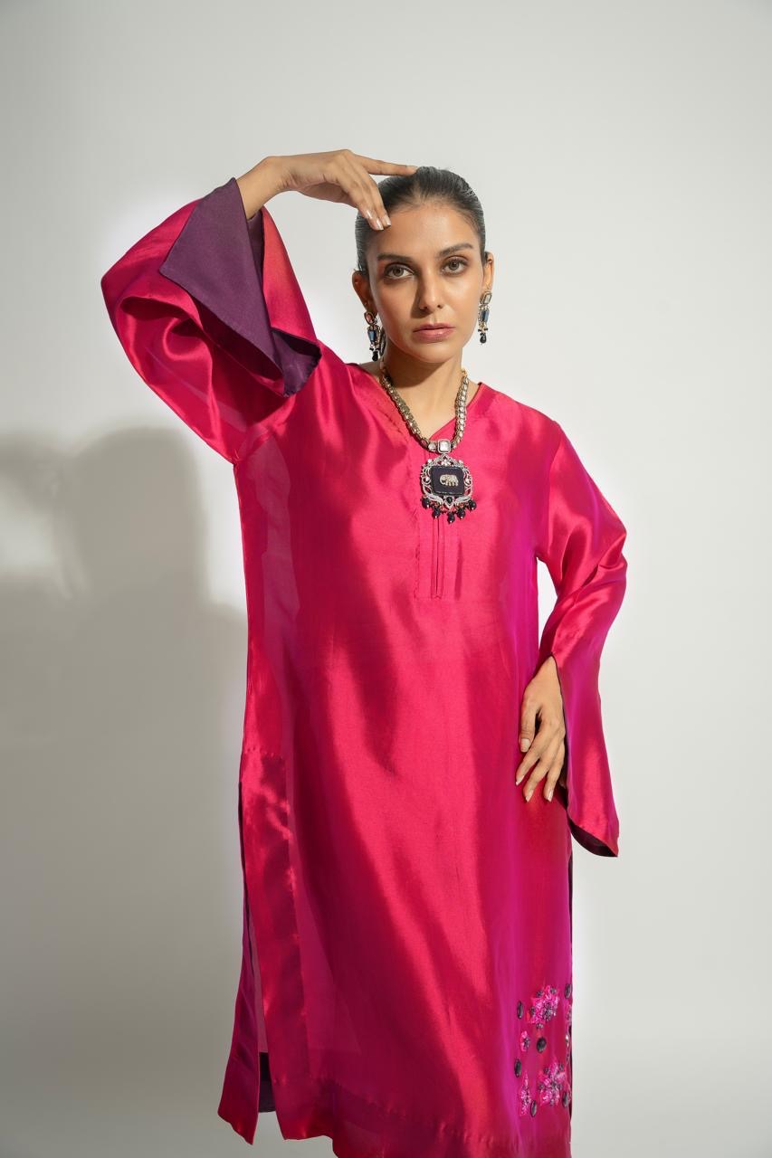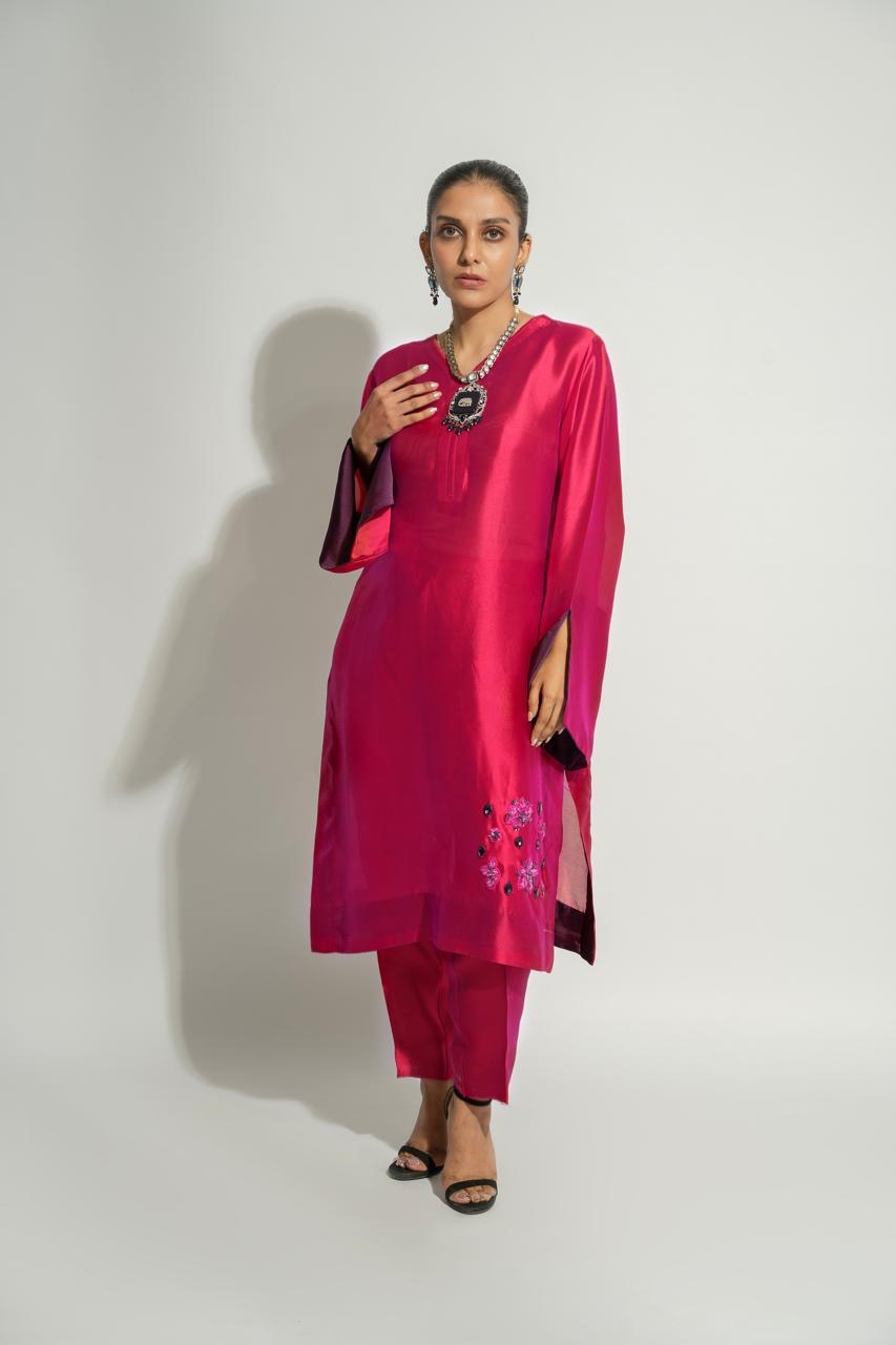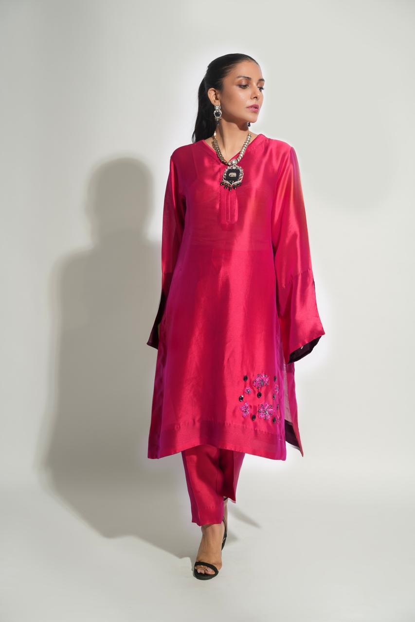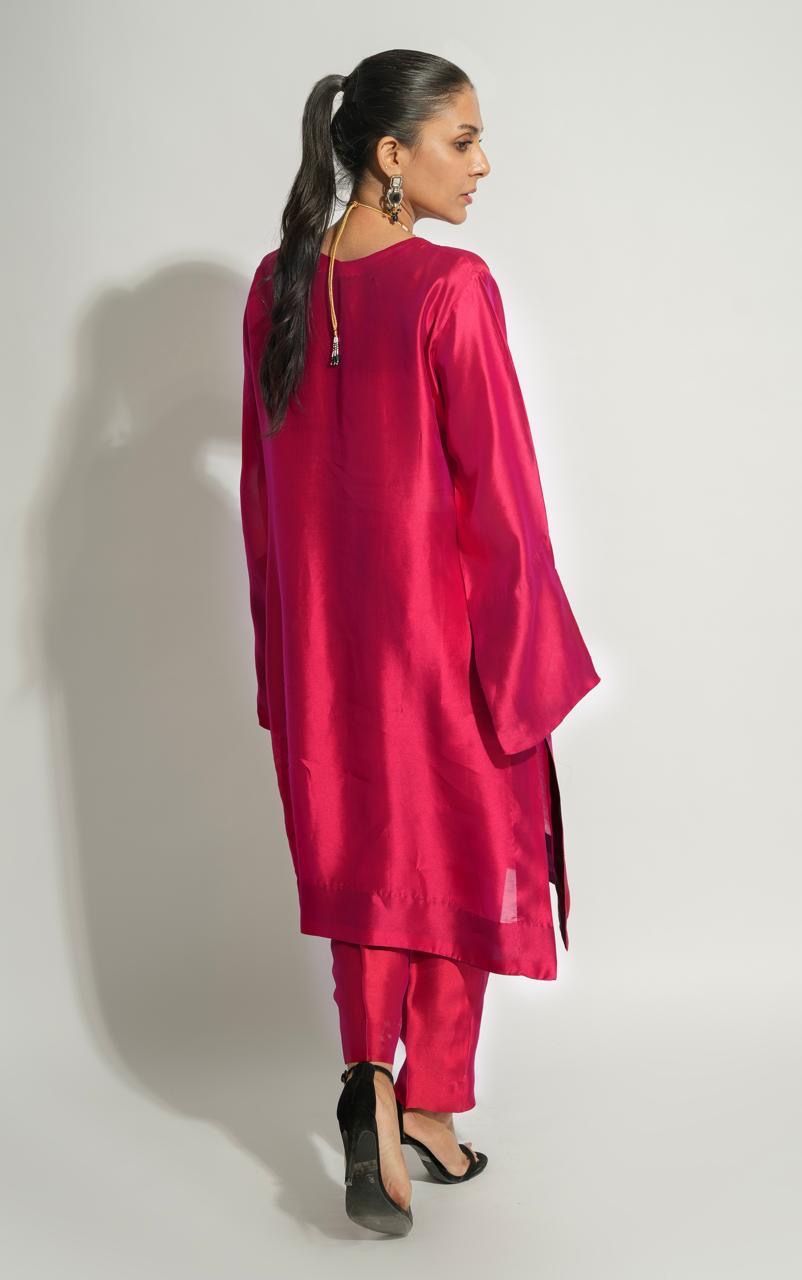 This deep red sheesha silk ensemble is a perfect blend of tradition and modern elegance. The tunic, made from luxurious, glossy sheesha silk fabric, features a relaxed fit with wide sleeves that create a tasteful silhouette. Delicate floral embellishments at the hem add a subtle yet impactful touch of glamour. Paired with matching slim-cut pants, this outfit offers both comfort and sophistication. Whether worn for festive occasions or evening events, this look is sure to make a bold statement with its vibrant hue and refined craftsmanship.