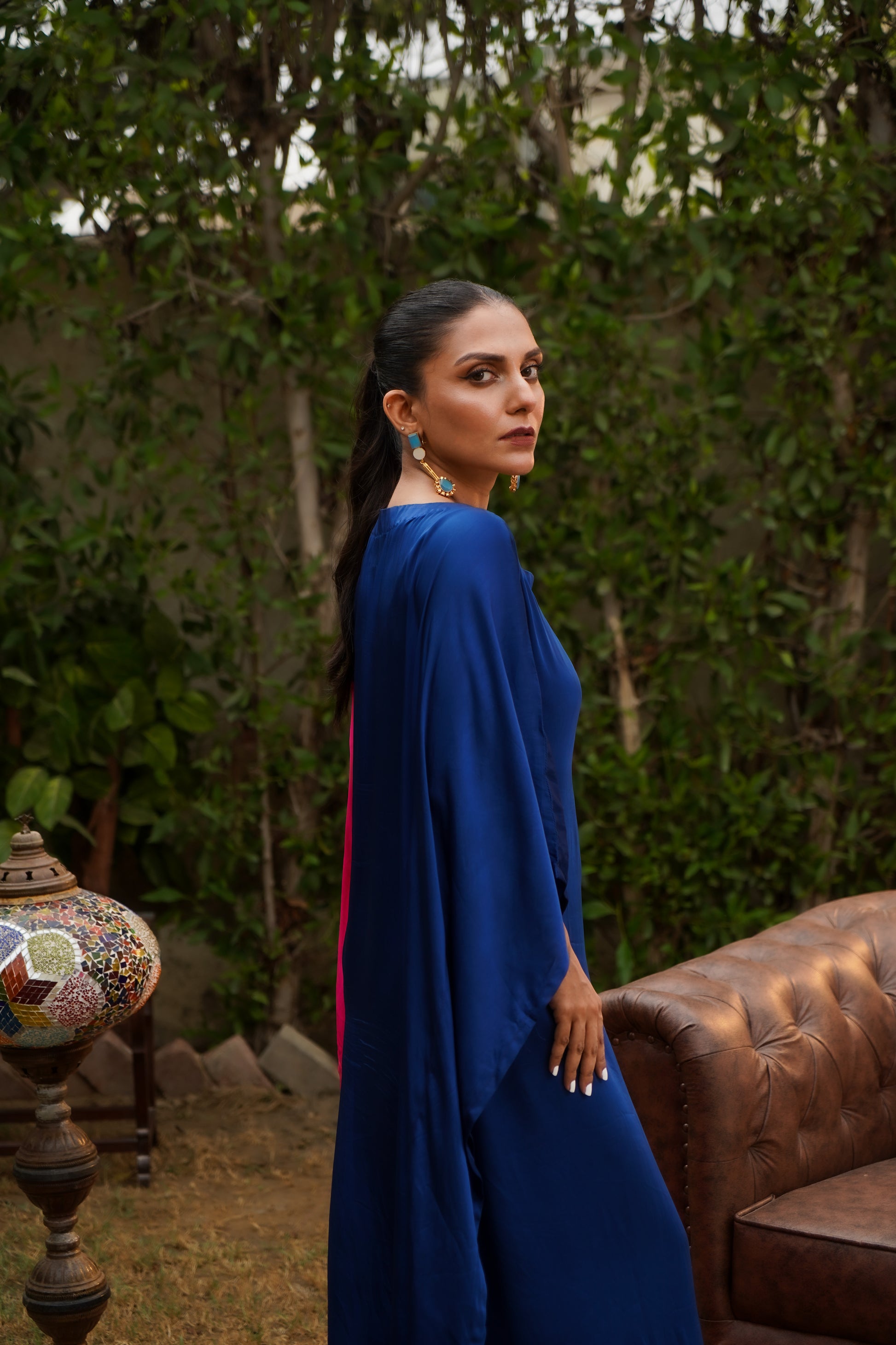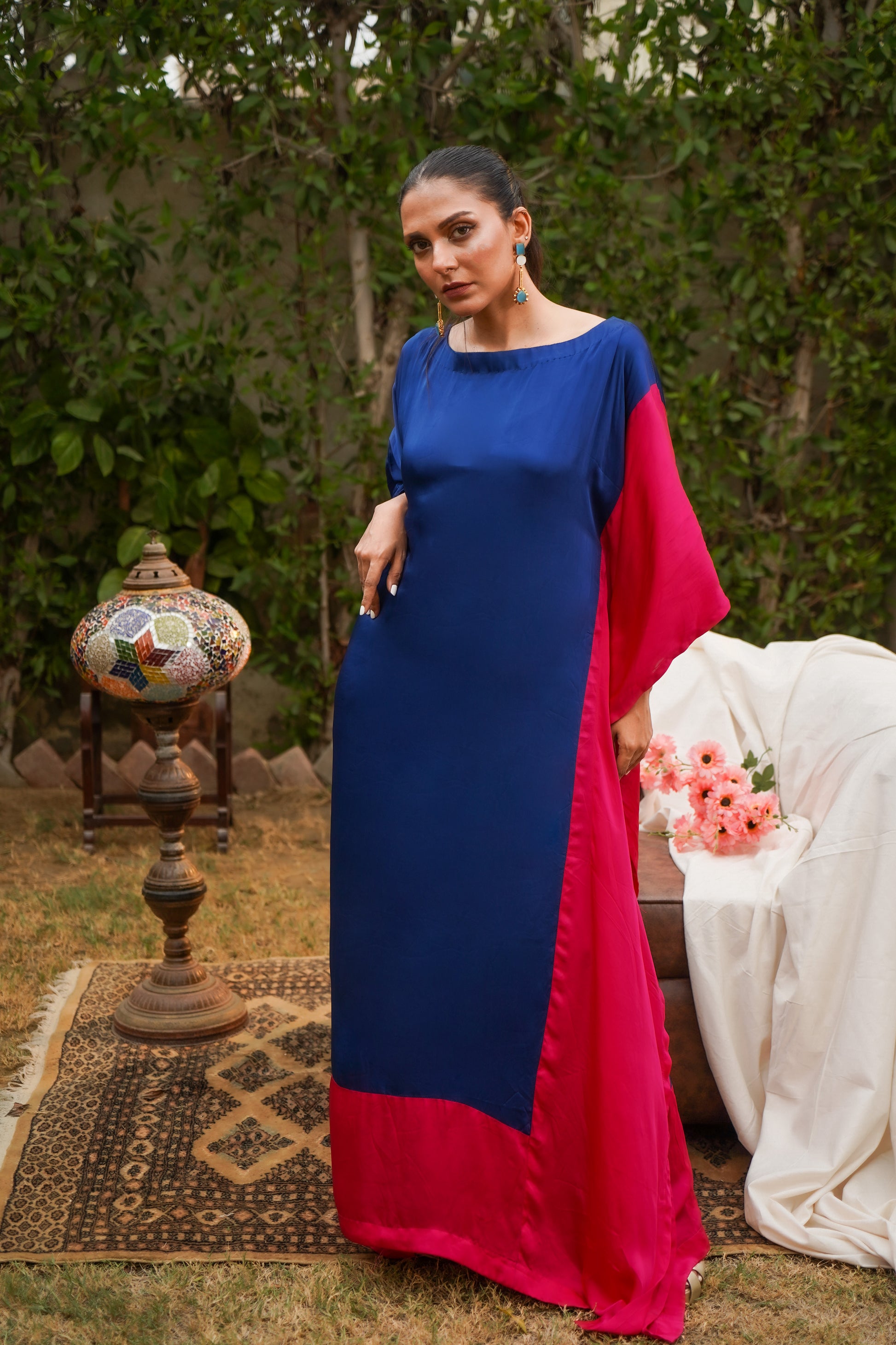 Indulge in luxury and freedom together with our silk boxy kaftaan. With a hot pink contrast adding that extra oomph to it, it shows off its modern cut and edgy style. The solid color enables you to flaunt those statement jewelry pieces without looking over the top.