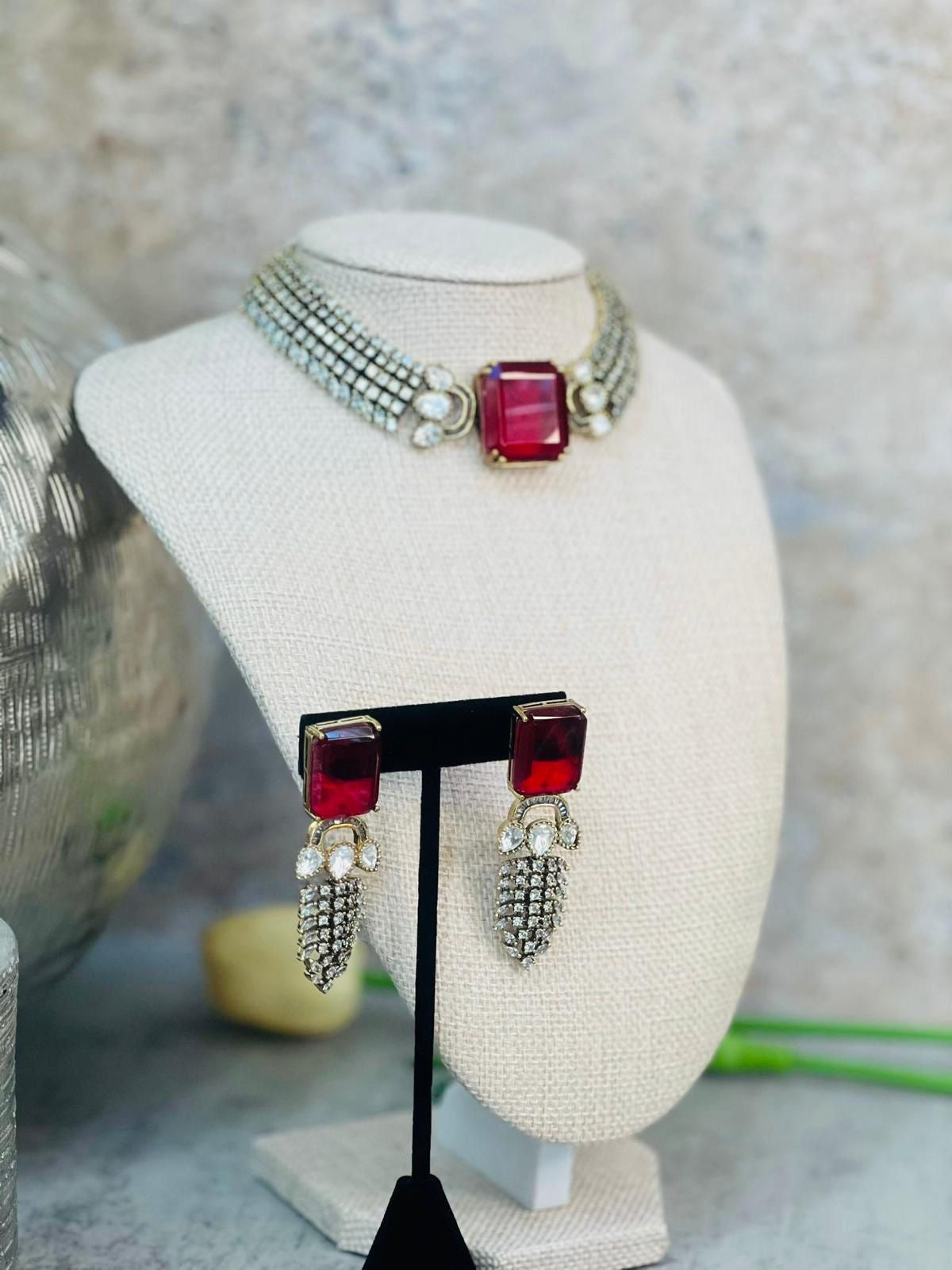 A sophisticated jewelry set featuring a dazzling red square centerpiece, complemented by a multi-strand choker adorned with shimmering crystals. Paired with matching statement earrings, this set exudes timeless elegance, perfect for formal events and festive celebrations.