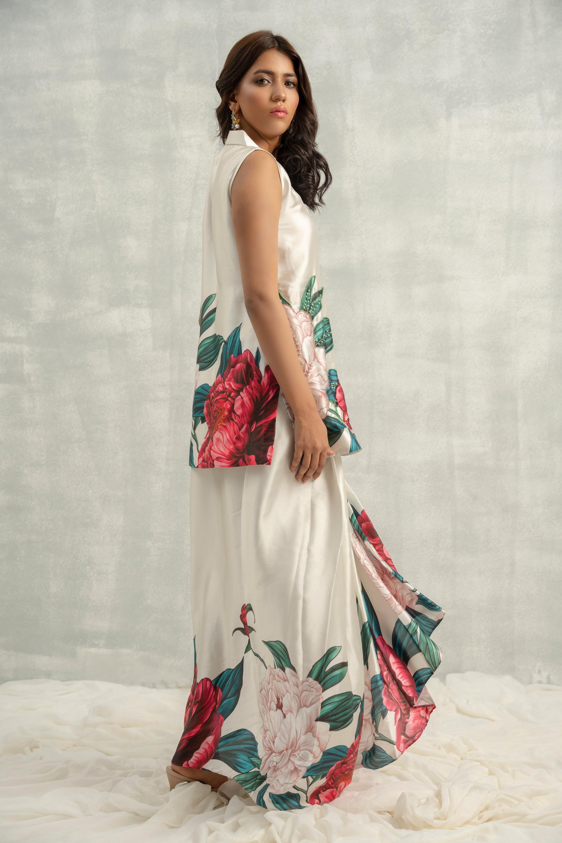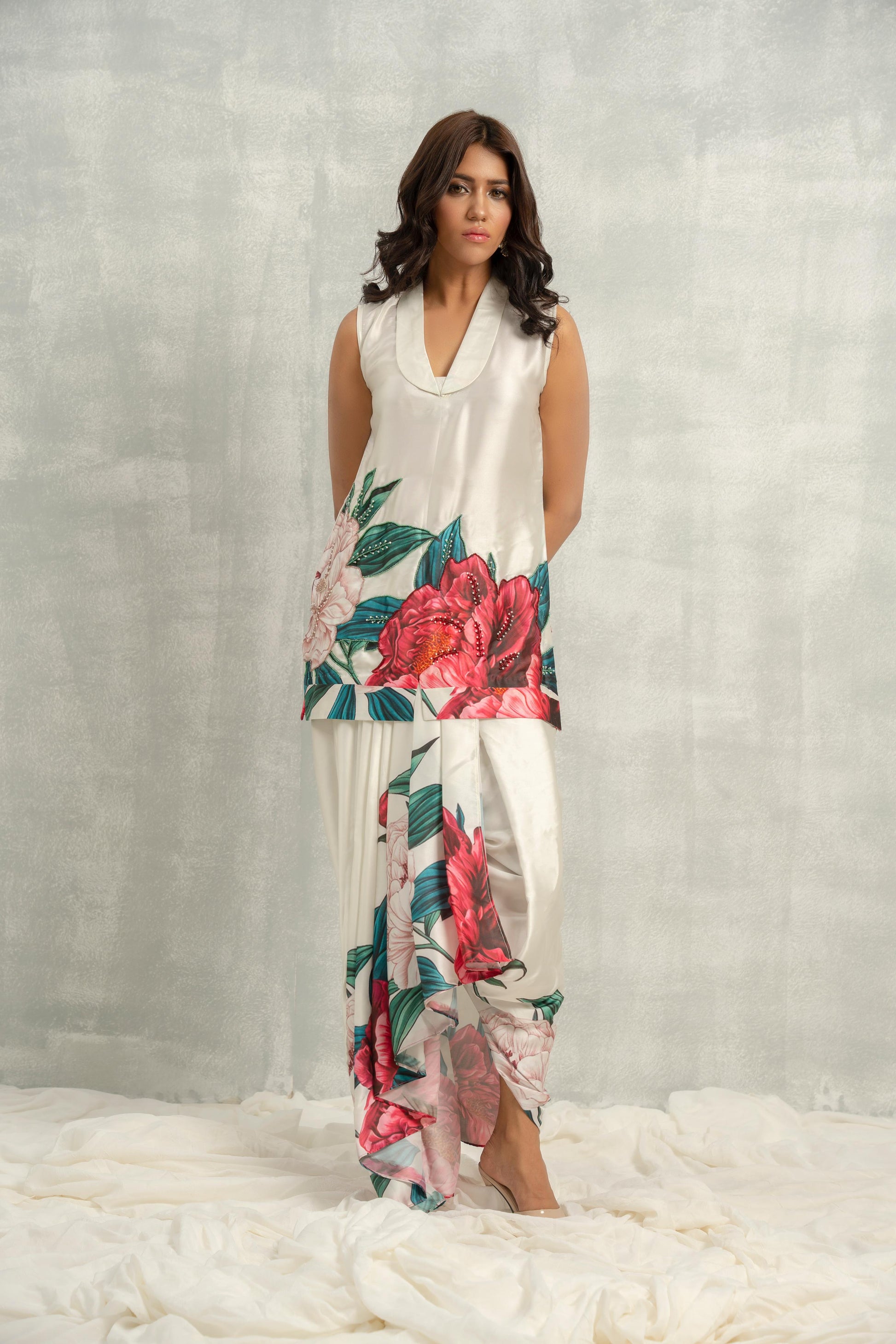 A printed charmeuse silk shawl collar top paired with a draped skirt. The top features beadwork and pearls that elegantly elevate the intricate print, creating a harmonious blend of artistry and modern design. Perfect for refined gatherings and celebrations.