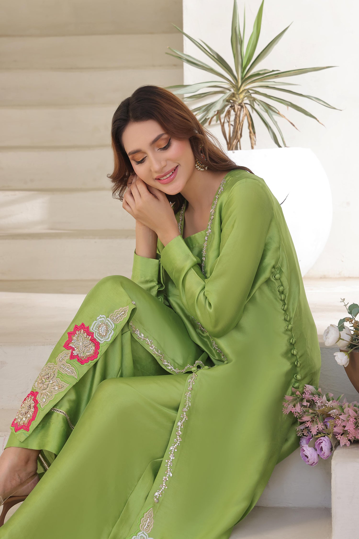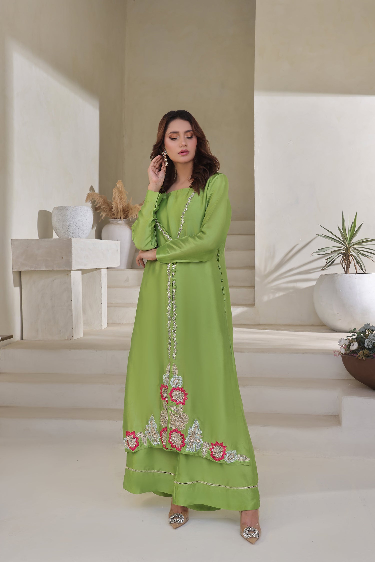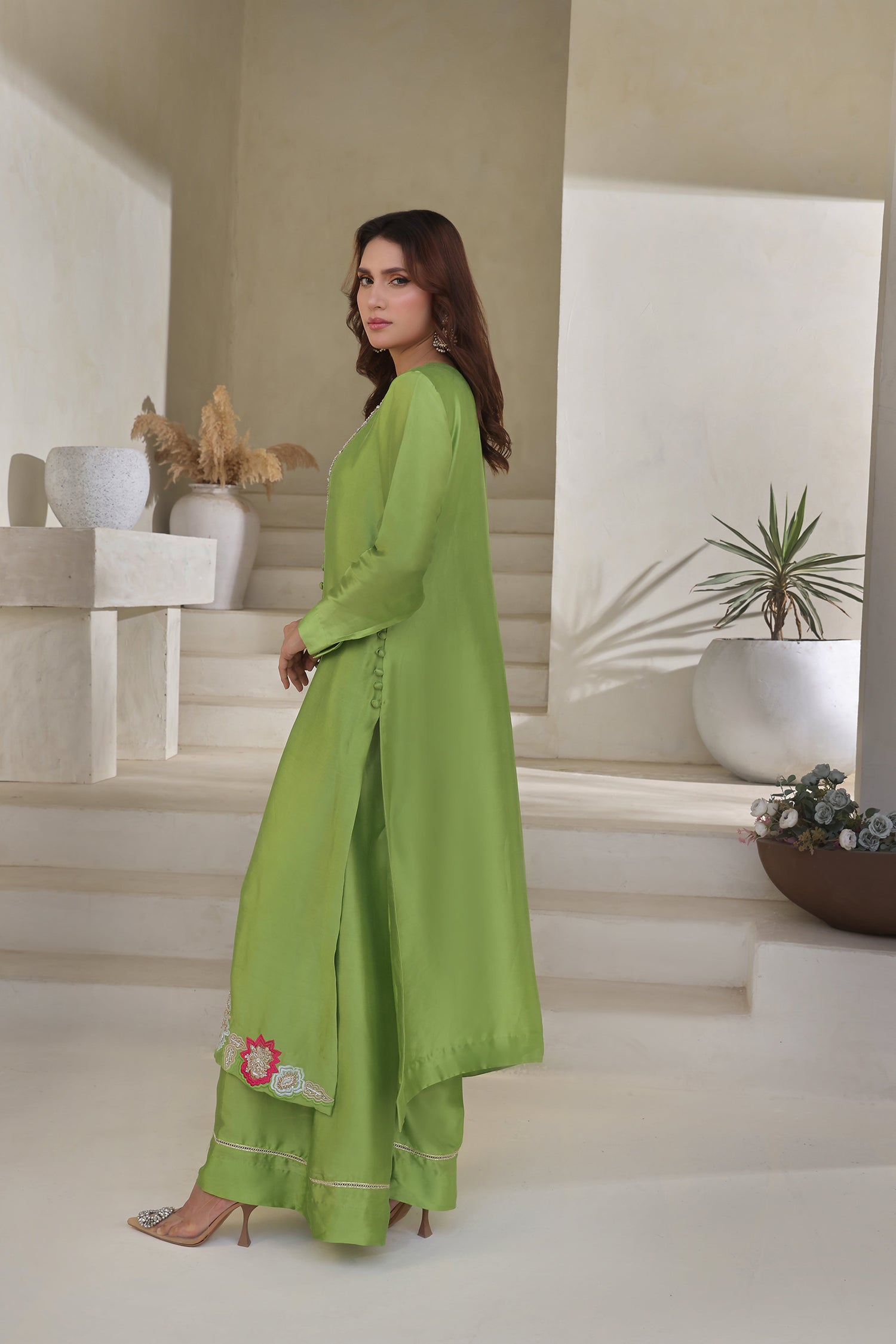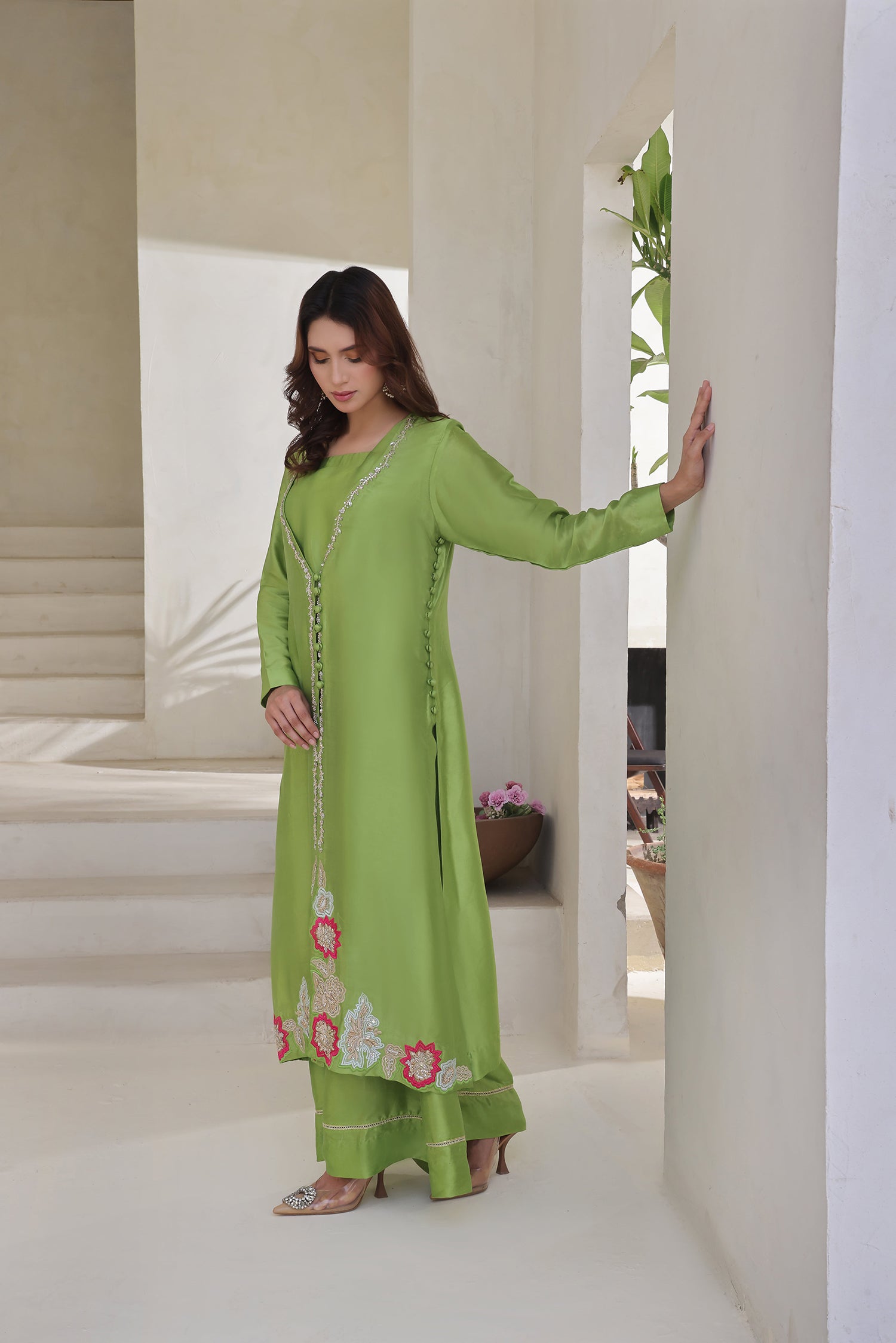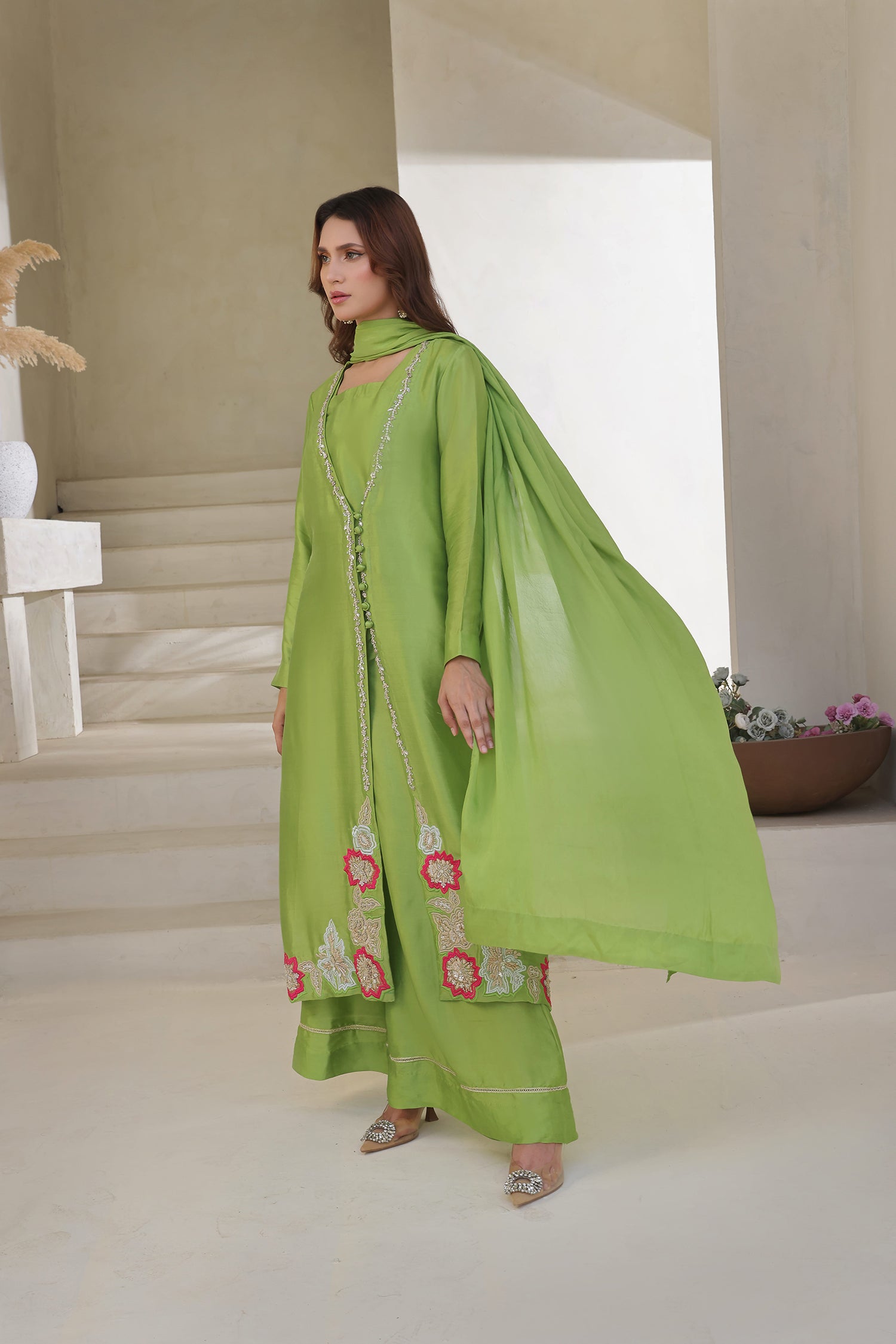 Radiate fresh festive charm in this striking apple green 3-piece ensemble, crafted in lustrous buttersilk. The long, straight-cut shirt features a stonework neckline and is adorned with intricate threadwork and delicate bead embellishment along the front placket. At the hem, bold floral appliqués in vibrant pinks and soft pastels add a playful yet elegant touch, giving the outfit a standout finish.