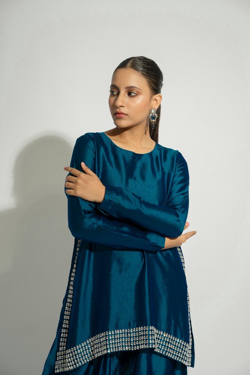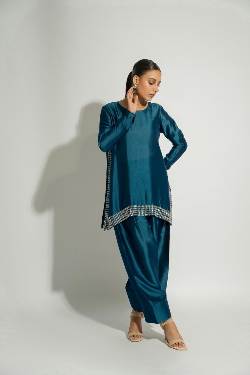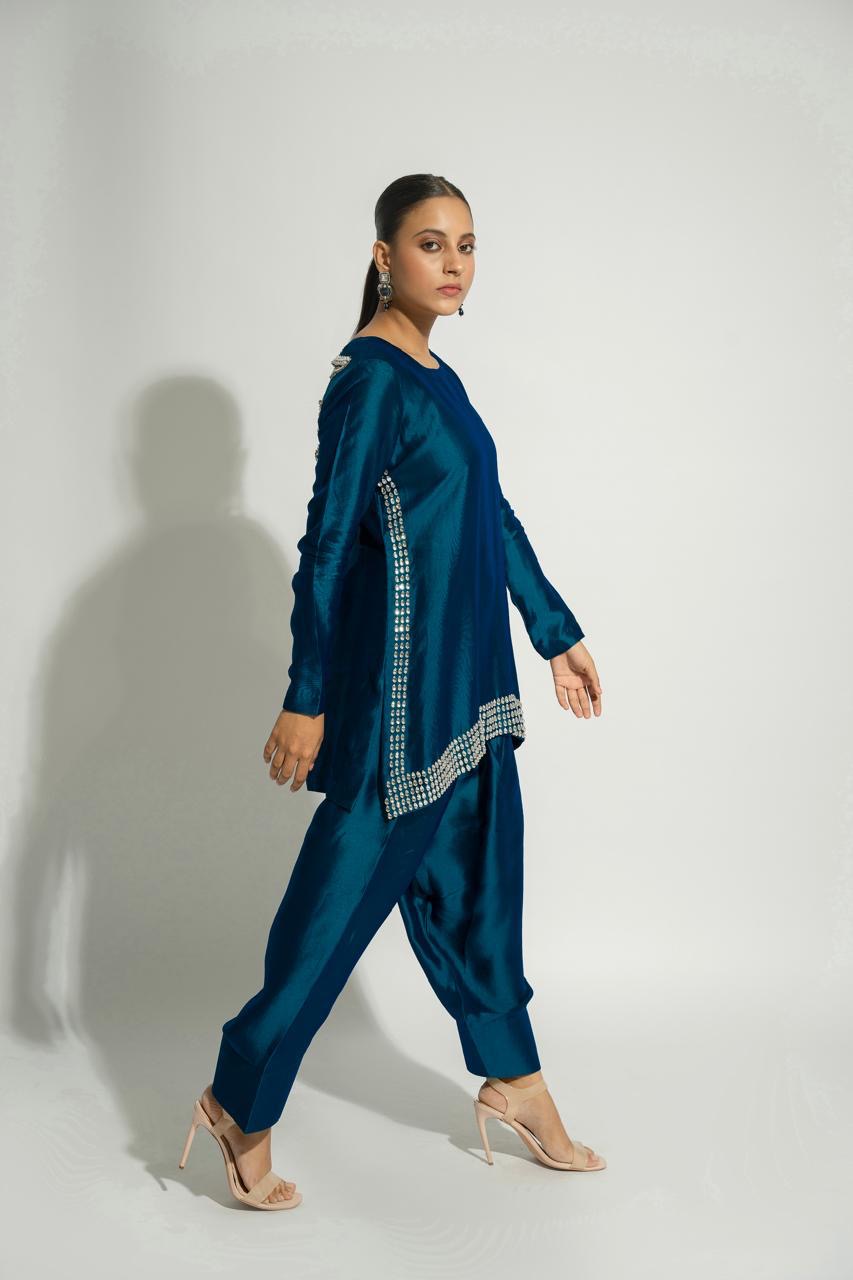 This stunning sheesha silk kameez, paired with a chic dhoti shalwar, effortlessly combines traditional elegance with modern flair. The front of the shirt features exquisite stone work that adds a touch of opulence, while the embellished cutwork details on the back create a captivating visual contrast. This ensemble is perfect for festive occasions, making it a standout choice for any celebration.