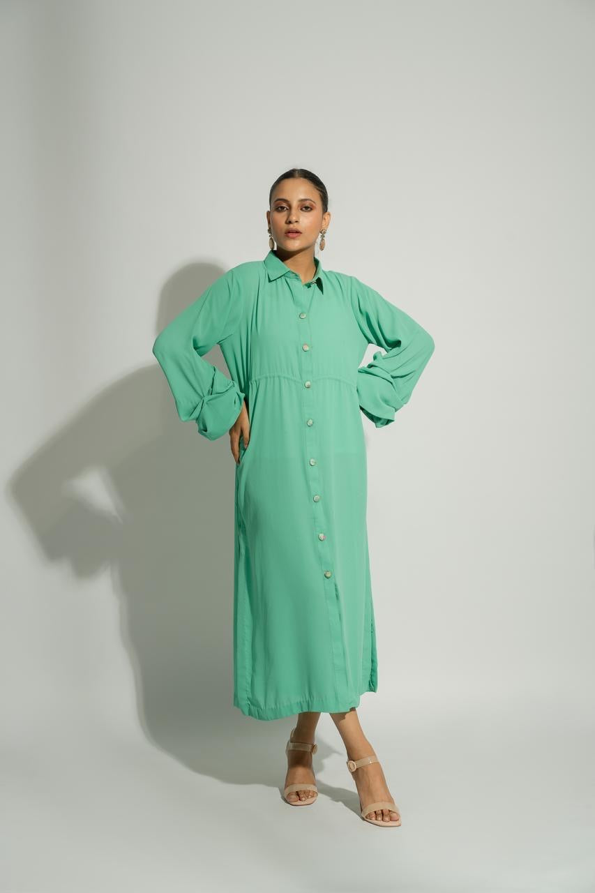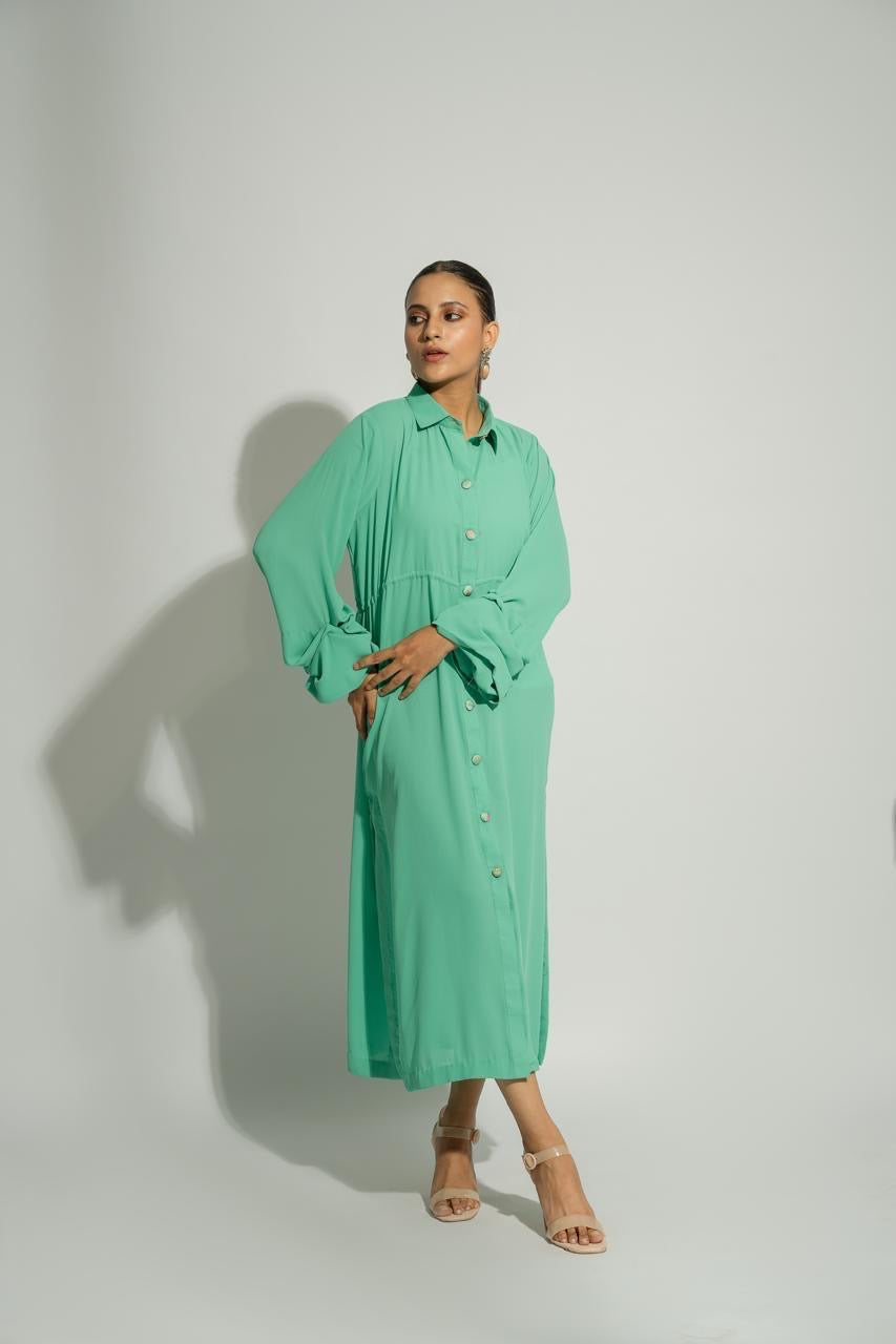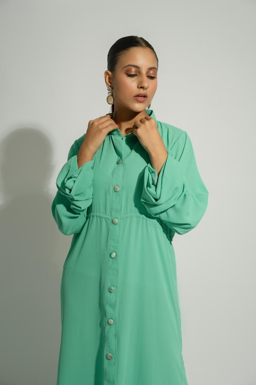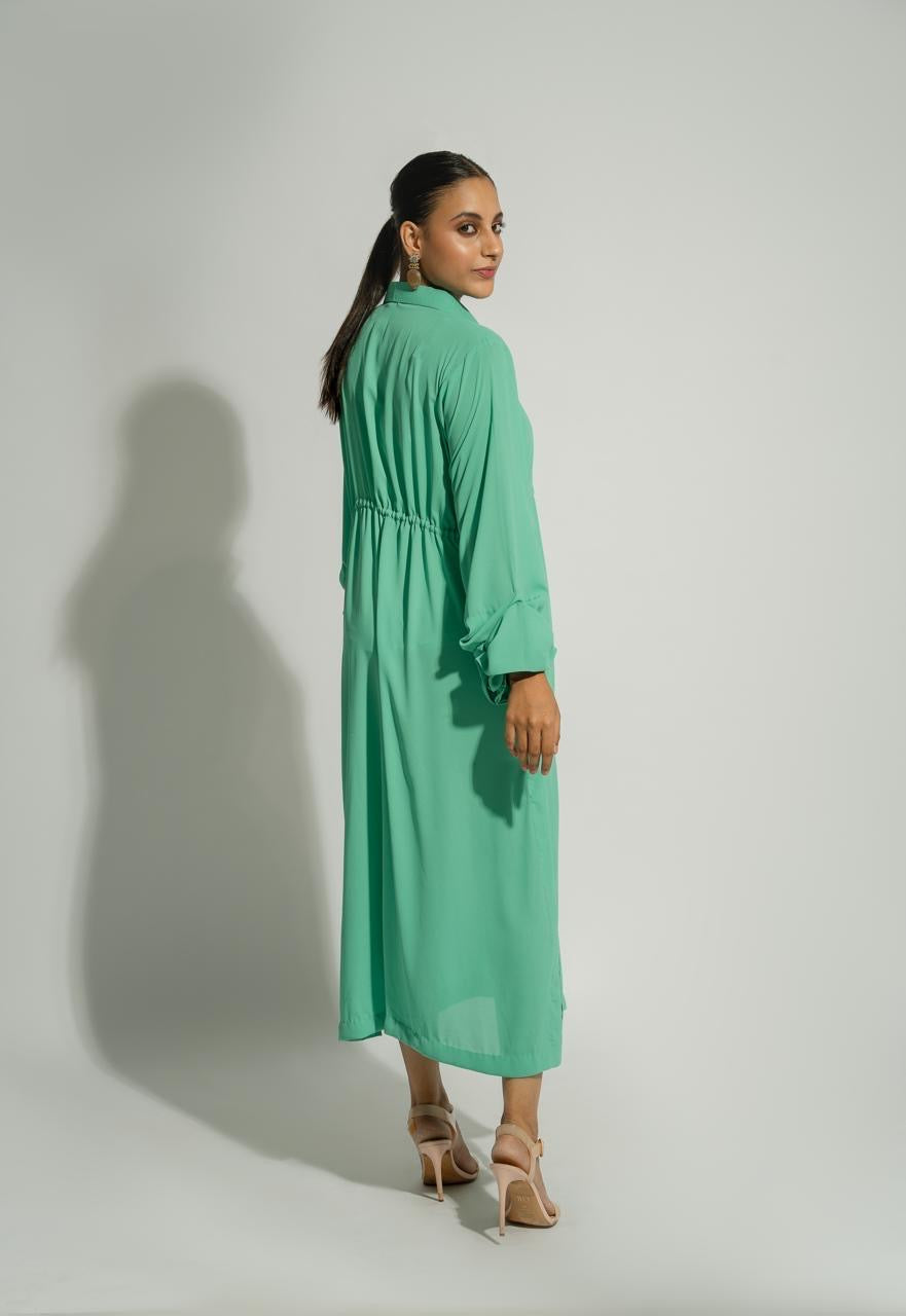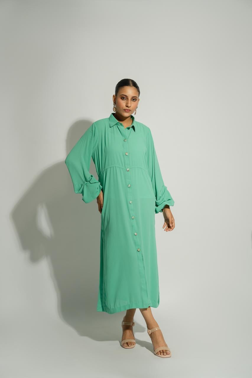 This casual georgette dress combines effortless style with everyday comfort. Featuring a flattering cinched waist, a button-down front, and a classic collar, this dress offers a chic yet relaxed look. Its lightweight fabric makes it perfect for warm days, while the versatile design allows for easy dressing up or down, making it a staple for your casual wardrobe.