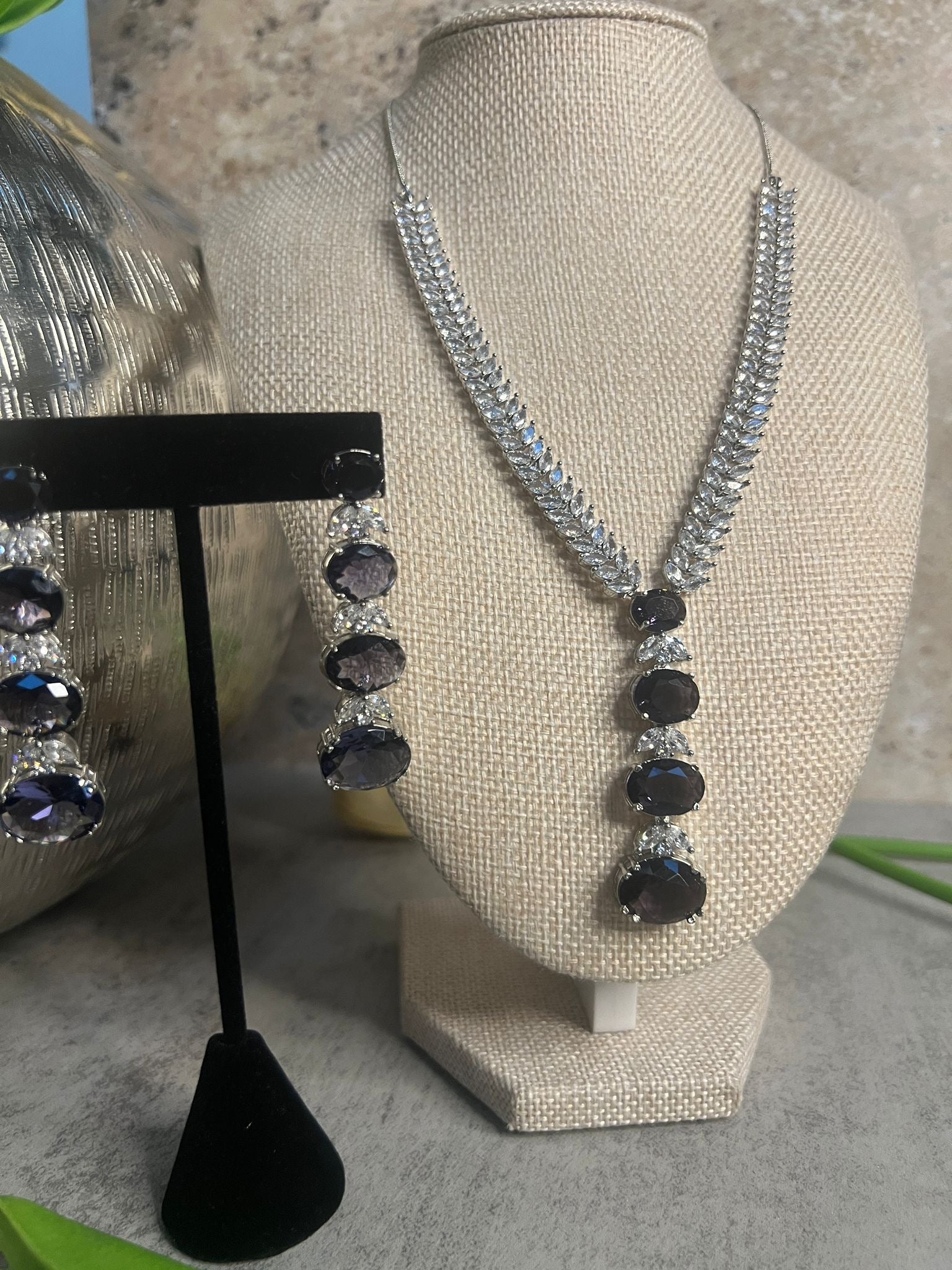 A sophisticated combination of deep violet gemstones and shimmering crystals, this necklace and earring set captures the allure of the evening sky. Perfect for making a refined statement at any event.