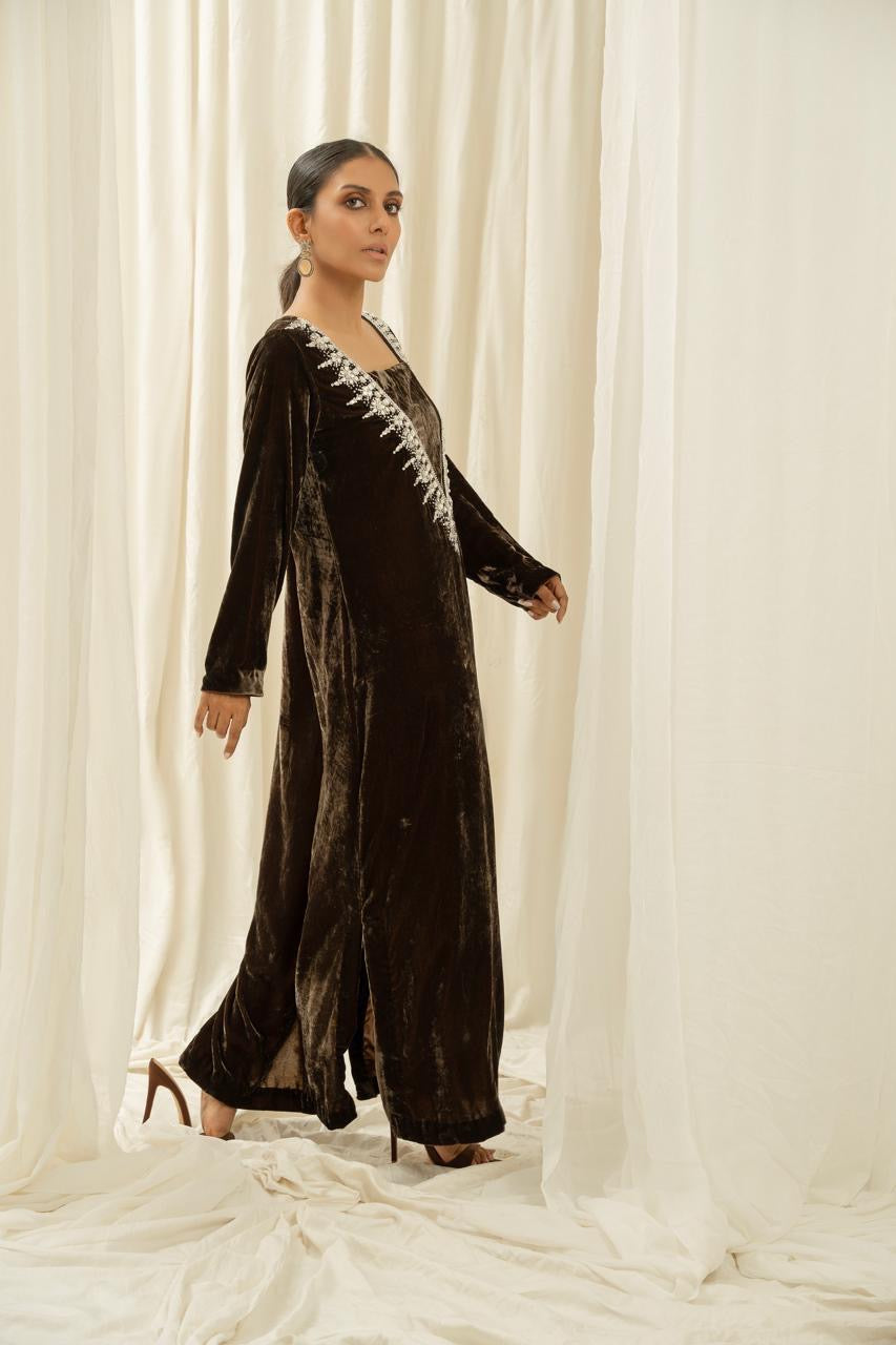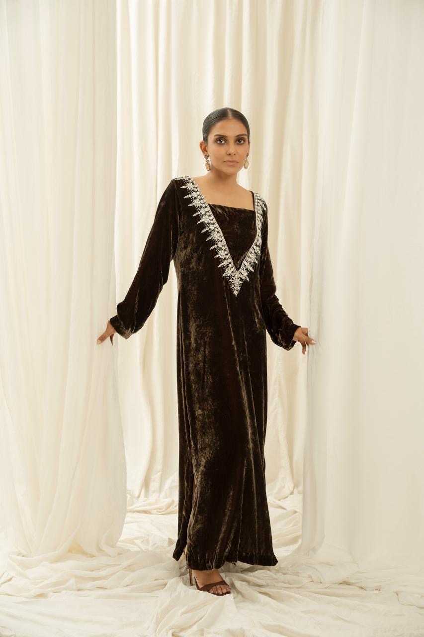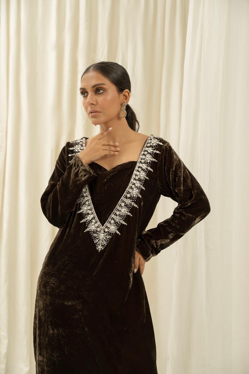 This opulent dark chocolate velvet ensemble is designed to deliver both elegance and contemporary charm. The flowing silhouette of the gown features a soft drape, exuding understated luxury. An intricately embellished V-neckline adds a touch of brilliance, perfect for elevating any evening look. With its plush fabric and relaxed fit, this piece is your ideal companion for formal dinners or festive occasions, offering a bold yet effortless statement.